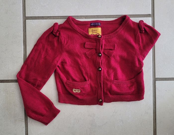 Gilet court, de couleur bordeaux avec touche de doré, de la marque Sergent Major, taille 5 ans (110 vm), en très bon état. Article lavé pour la vente.