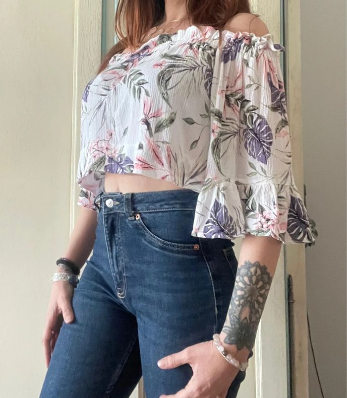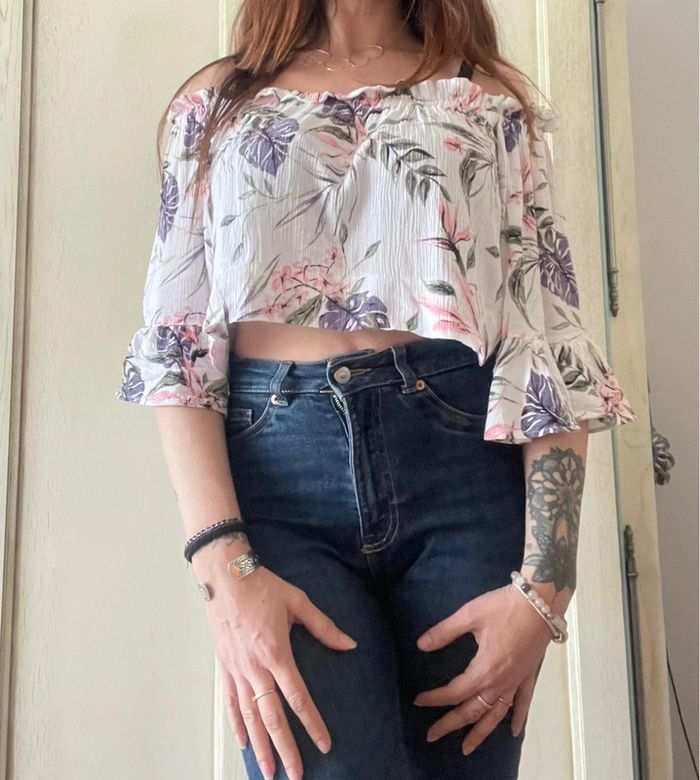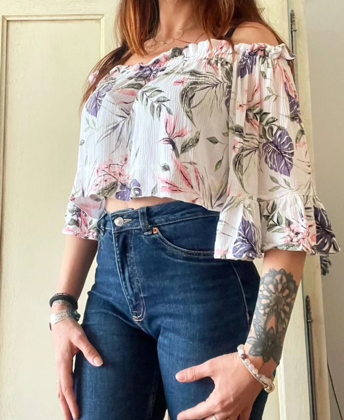 Joli top avec manches à volants et épaules dénudées pour l’été taille 44