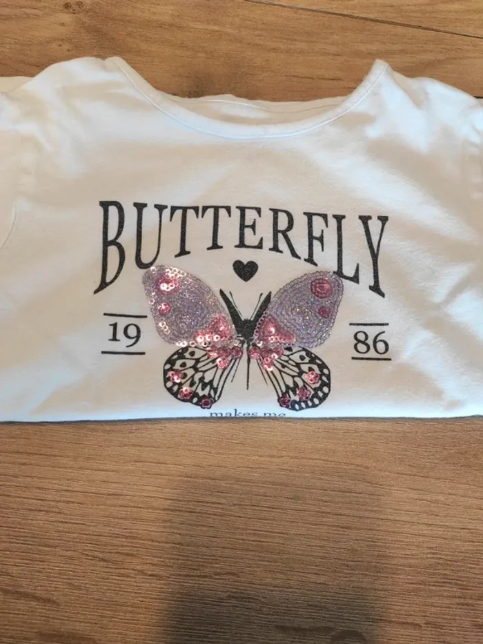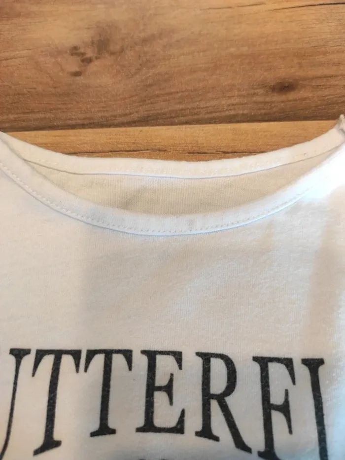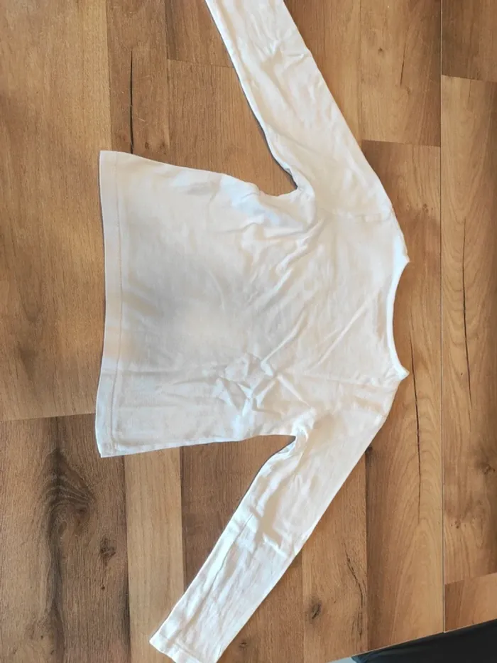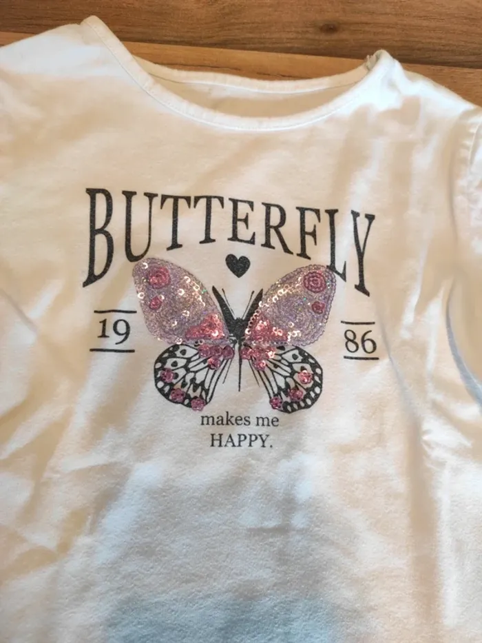 Tee-shirt ML 4 ans in extenso en état satisfaisant car petite tâche en haut du Tee shirt Et le noir du dessin est moins noir qu'au début voir photos #4ansmarygio59fille