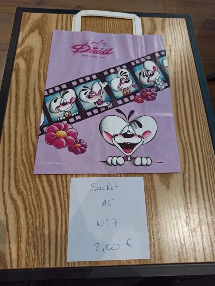 Sachet en papier Diddl A5 avec anses N°7 Le prix du sachet est de 2,00€ (A noter qu'un seul sachet sera vendu pour ce prix). En très bon état mais peut cependant présenter des traces de manipulation. Je vends également d'autres articles Diddl, des feuilles diddl, des papiers à lettres, des sac et sachets. N'hésitez à me donner la liste de vos feuilles manquantes. Article d'occasion, pas de reprise, ni d'échange.