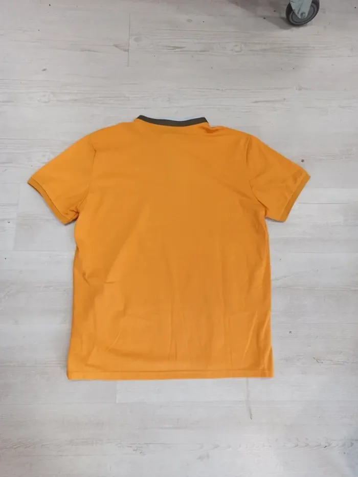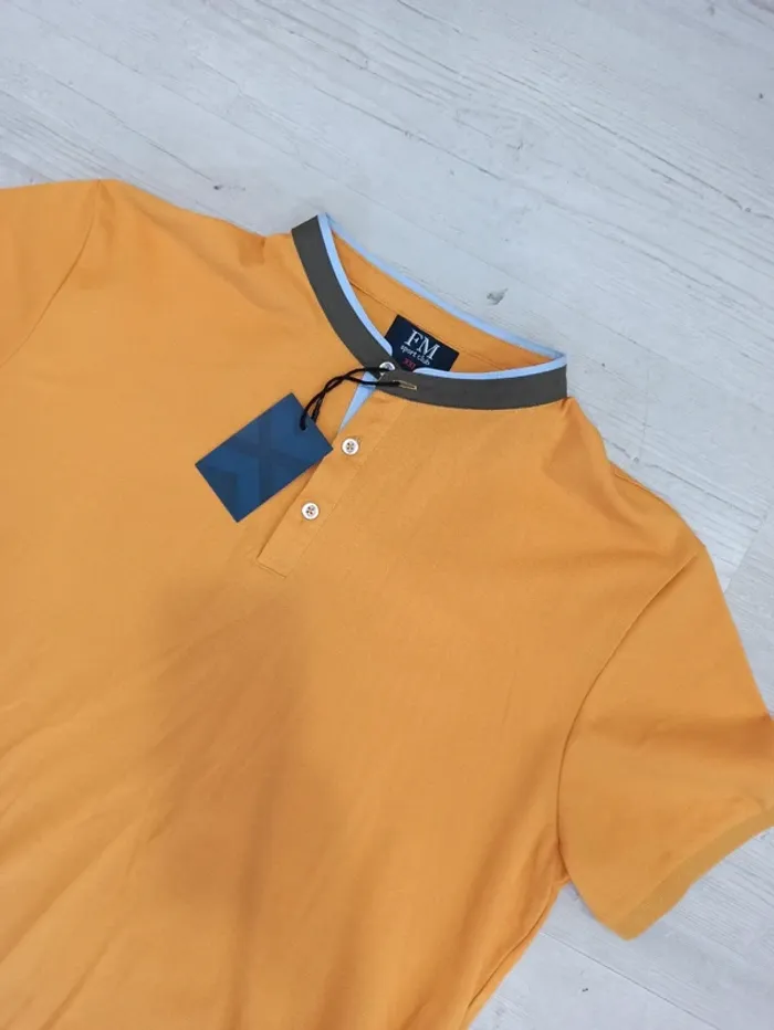 Polo moutarde uni manches courtes, col mao. Boutons sur le devant. Taille : xxl Mesure dessous de bras à dessous de bras : 59cm Article neuf avec étiquette. Prix sur l'étiquette : 24,99€. P2011 moutarde xxl N°1
