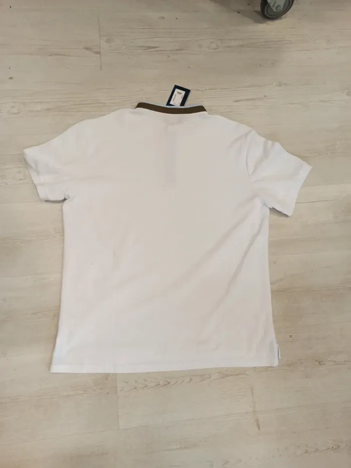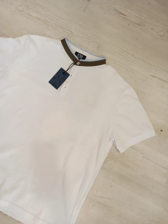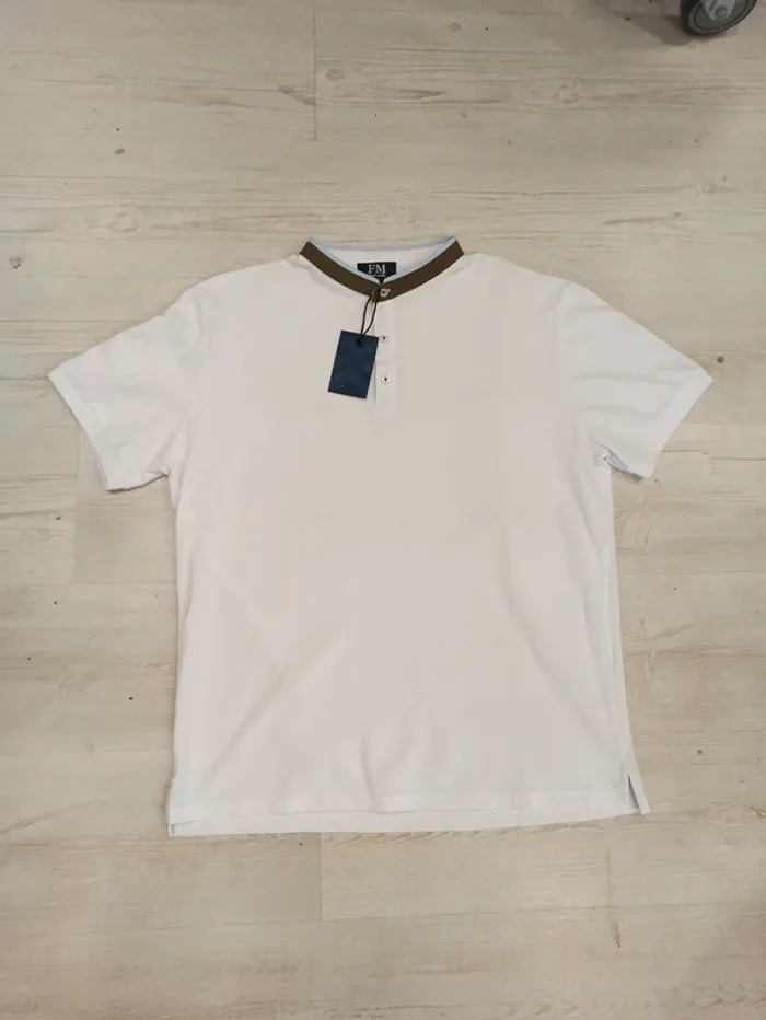 Polo blanc uni manches courtes pour homme avec col mao. Boutons sur le devant. Taille : xxl Mesure dessous de bras à dessous de bras : 60cm Article neuf avec étiquette. Prix sur l'étiquette : 24,99€. P2011 blanc xxl N°1