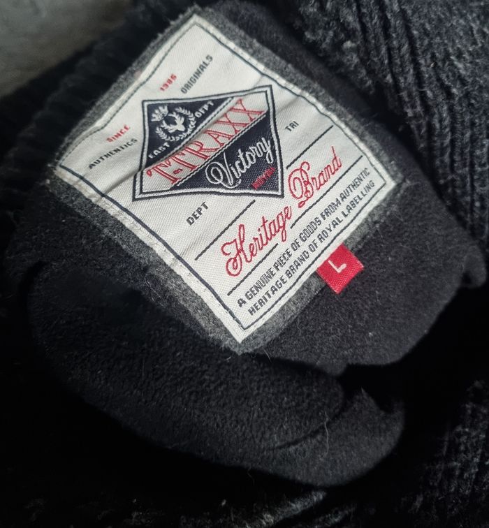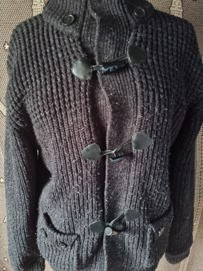 Veste noir à boutons, taille L marque T-Traxx, 2 poches, longueur 69cm, largeur 51cm, longueur épaule à aisselle 25cm, largeur aisselle à aisselle 56cm, longueur manche 55cm, intérieur polaire.