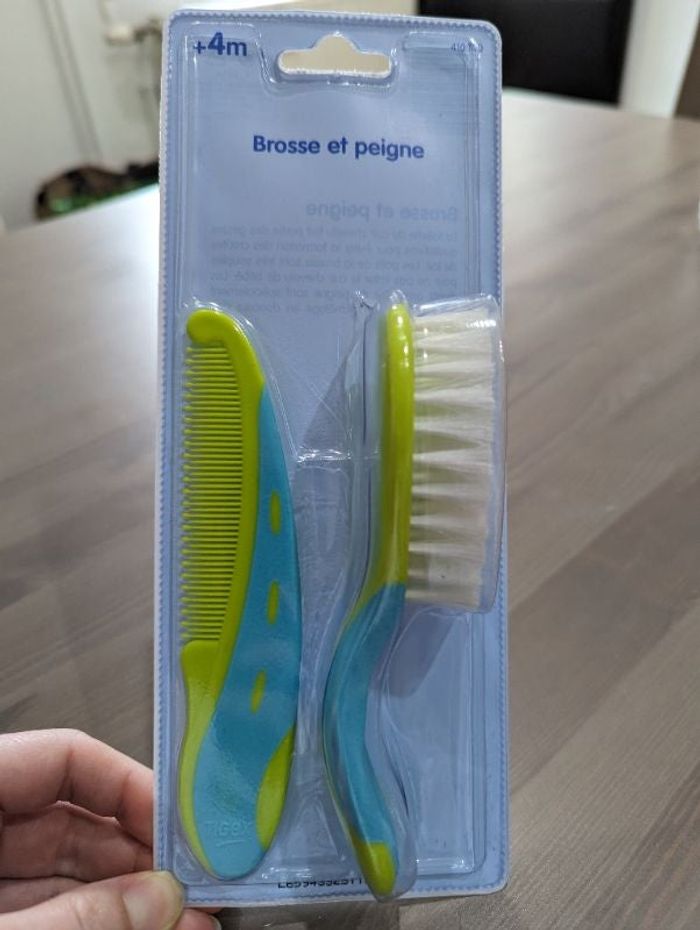 1 lot brosse et peigne. Marque Tigex. NEUFS SOUS BLISTER Bonjour, Vends : 1 lot brosse et peigne. Marque Tigex. NEUFS SOUS BLISTER Couleur : turquoise et vert « La toilette du cuir chevelu fait partie des gestes quotidiens pour éviter la formation des croûtes de lait. Les poils de la brosse sont très souples pour ne pas irriter le cuir chevelu de bébé. Les dents arrondies du peigne sont spécialement étudiées pour un démêlage en douceur des cheveux de bébé. » Mots clés : cheveux peigne brosse bébé enfant Prix : 4 €.