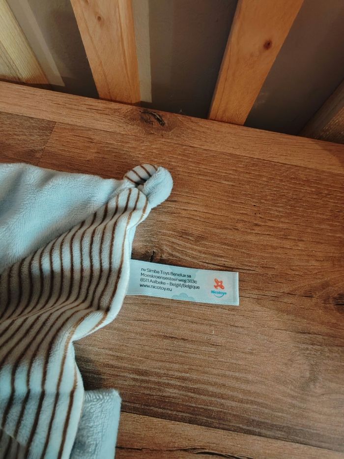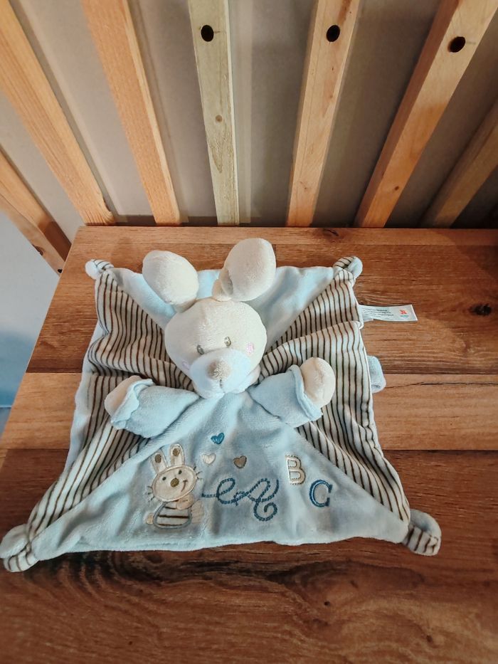 Doudou plat lapin rayé bleu ABC attache tétine NICOTOY Tbe Étiquette marque présente 9.90 euros Envoie en relais