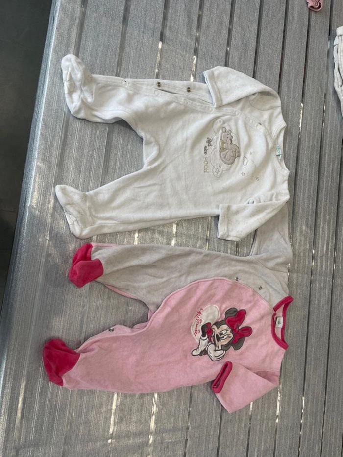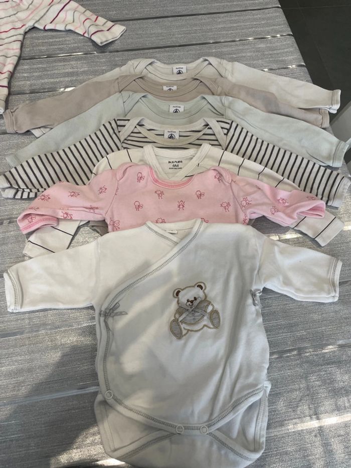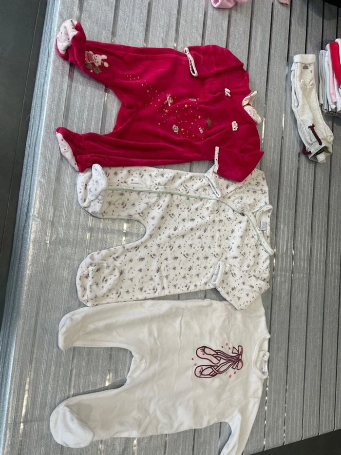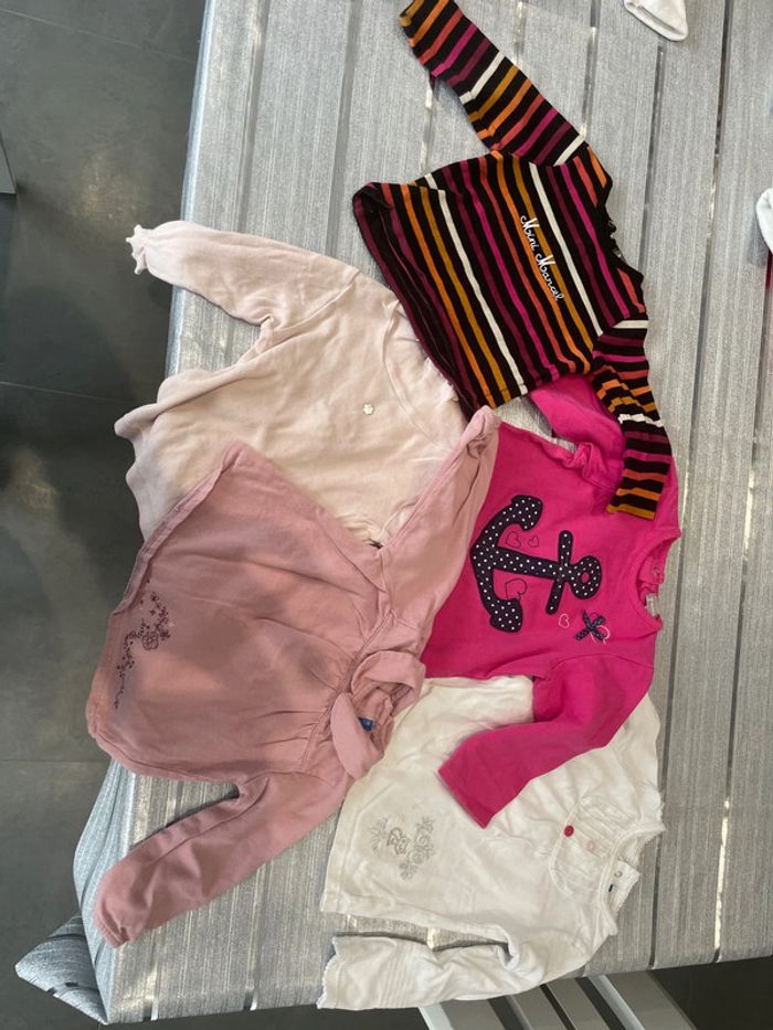 Avec 7 bodies, 5 t shirts manches longues, 1 pantalon de jogging épais, 1 pull fin et 1 polaire , et 5 pyjamas. Bon état, certains bodies sont un peu tachés au col (voir photos) Plusieurs marques : petit bateau, orchestra, converse, Disney, in extenso