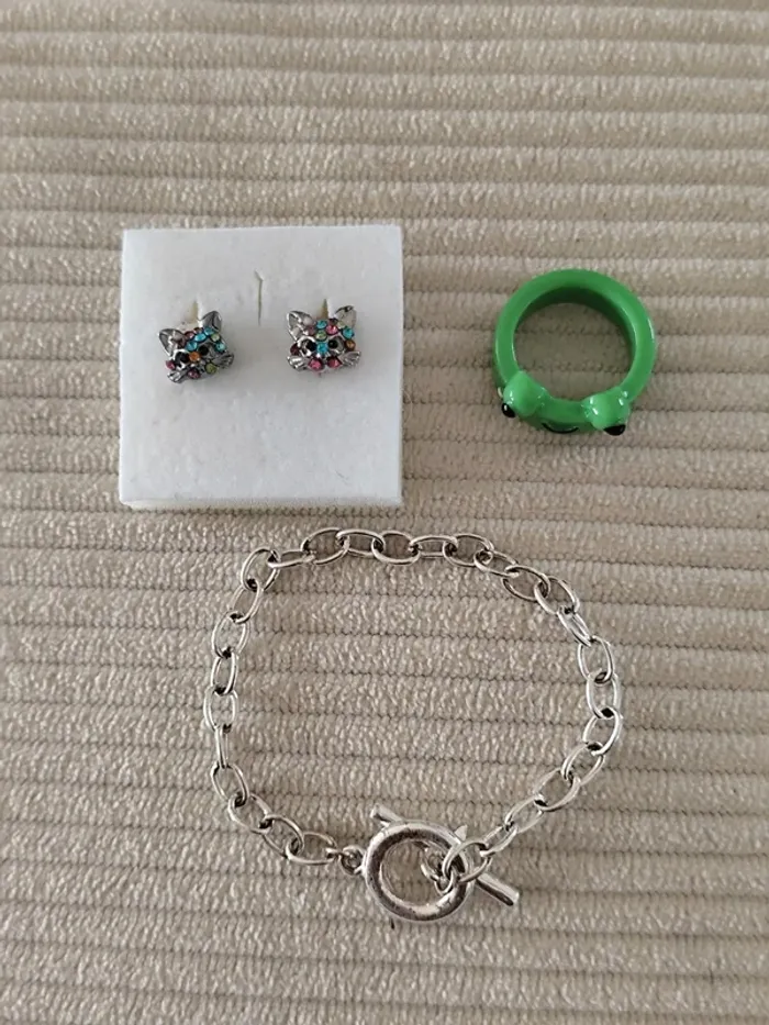 #sev8059accessoiresfille #sev8059bijoux Lot bijoux fille, boucles d'oreilles + bracelet en bon état + bague grenouille neuve Voir mes autres ventes pour regrouper