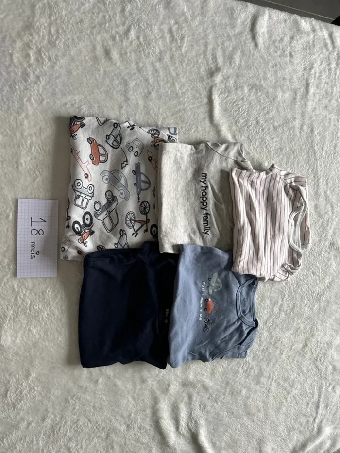 Lot de 5 bodys manches longues Gémo 3 en parfait état et 2 un peu tachés (le rayé et le blanc avec les voitures) #nellypoupy18mois