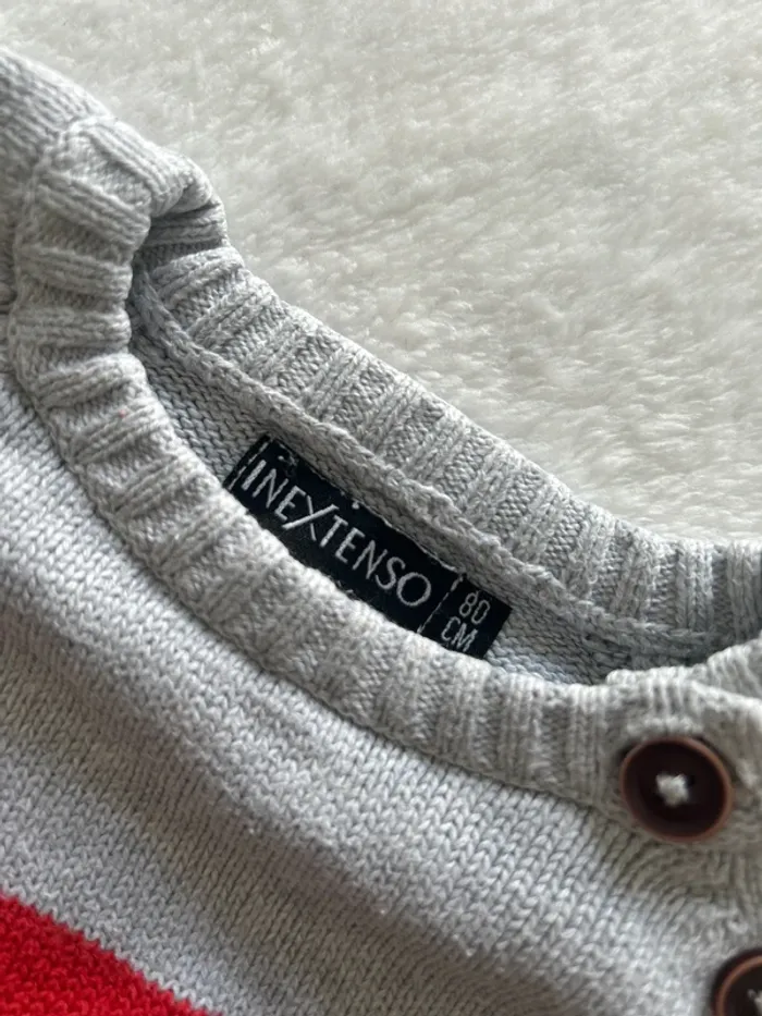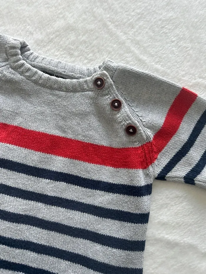 Pull en coton type tricot mailles serrées Gris rayé rouge et marine En parfait état, 18mois #nellypoupy18mois