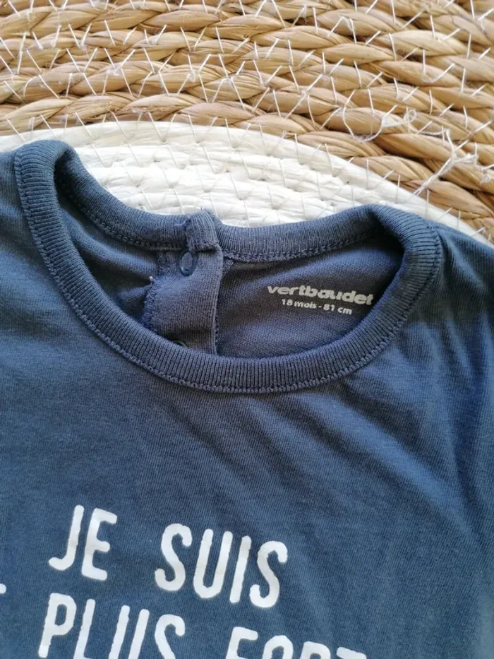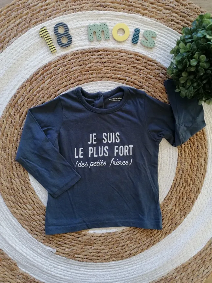 🧒🏻 Tee-shirt manches longues bleu "Je suis le plus fort des petits frères" 🧒🏻 Vertbaudet : 18 mois