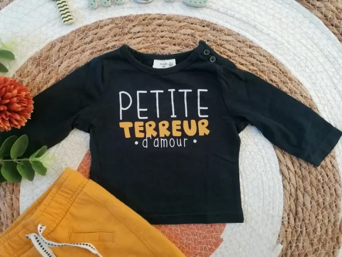 🧒🏻 Ensemble jogging moutarde + tee-shirt manches longues bleu marine 🧒🏻 Kiabi : 1 mois