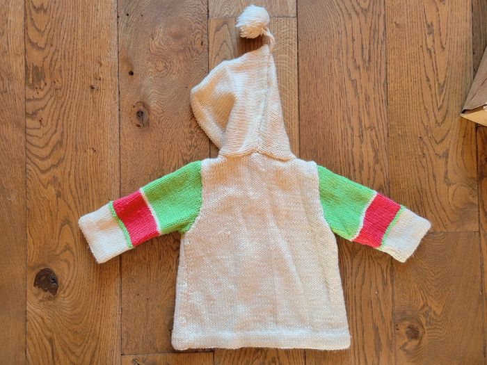 en laine phildar Long Gilet tricoté main avec une capuche pompon Coloris écru, rose, vert #giletbebe #phildar #tricotemain