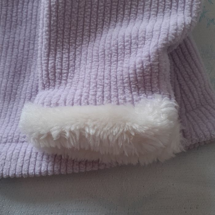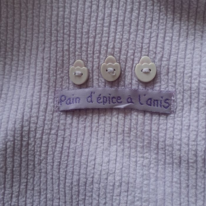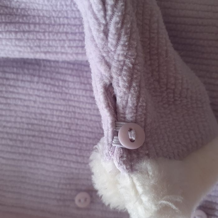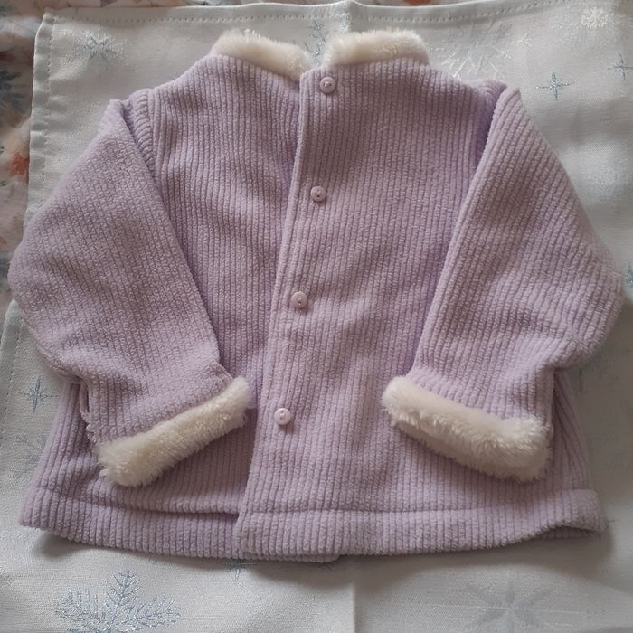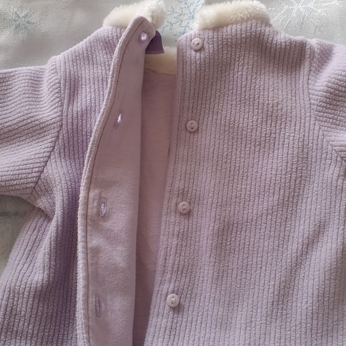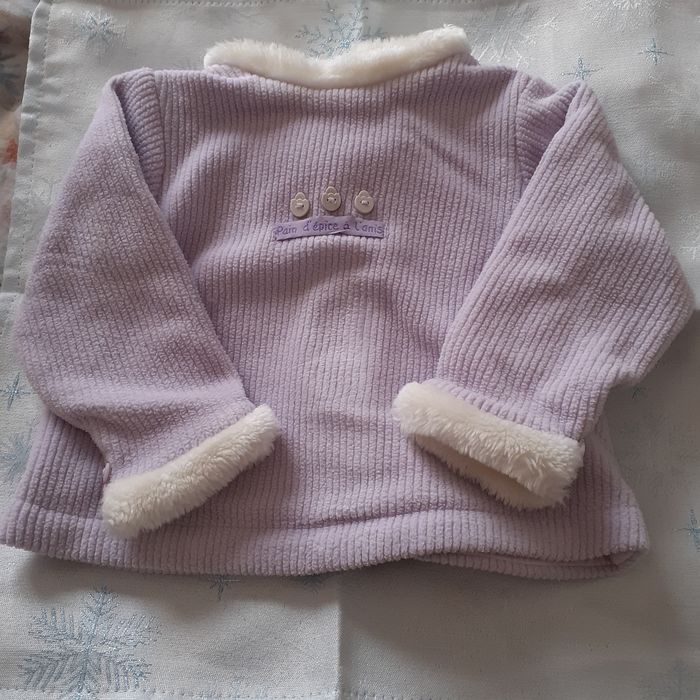 Sweat coloris mauve marque DPAM; taille 6 mois. Tissu côtelé velouté; fausse fourrure col et manches. Boutons manches avec attaches élastiquées; fermeture dos par boutons. Lavable à 30°. Noté en bon état car qq bouloches sur tissu intérieur // voir photos pour détails
