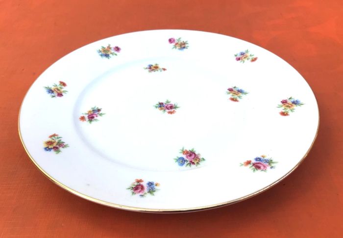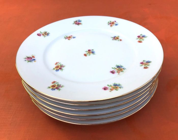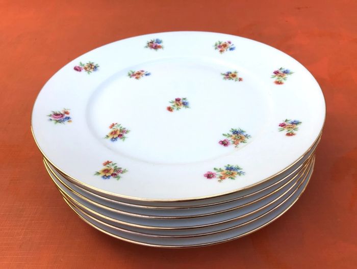 6 assiettes plates anciennes Porcelaine blanche liseré or à décor brassées de fleurs P.N France Diamètre : 235mm Hauteur : 25mm Poids total : 2kg580 Lot B