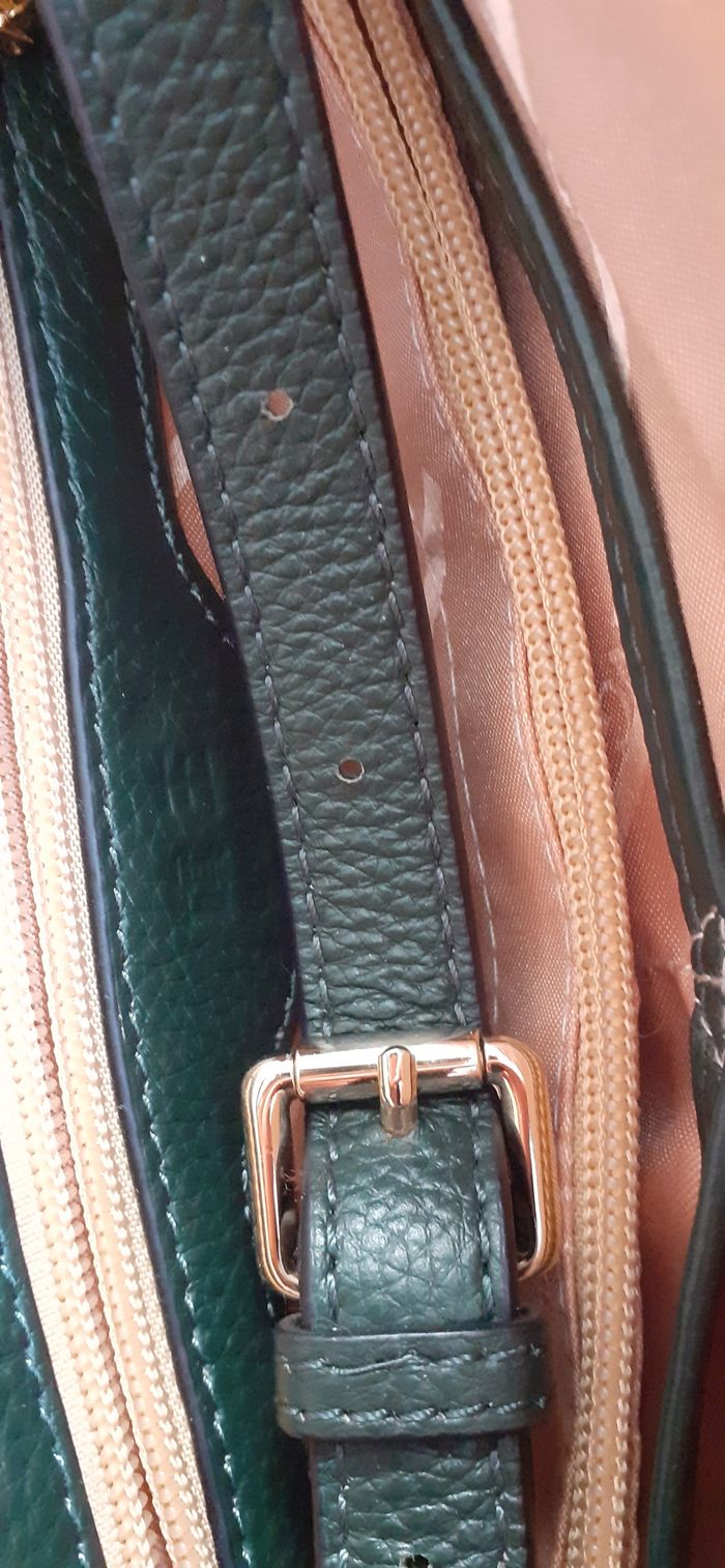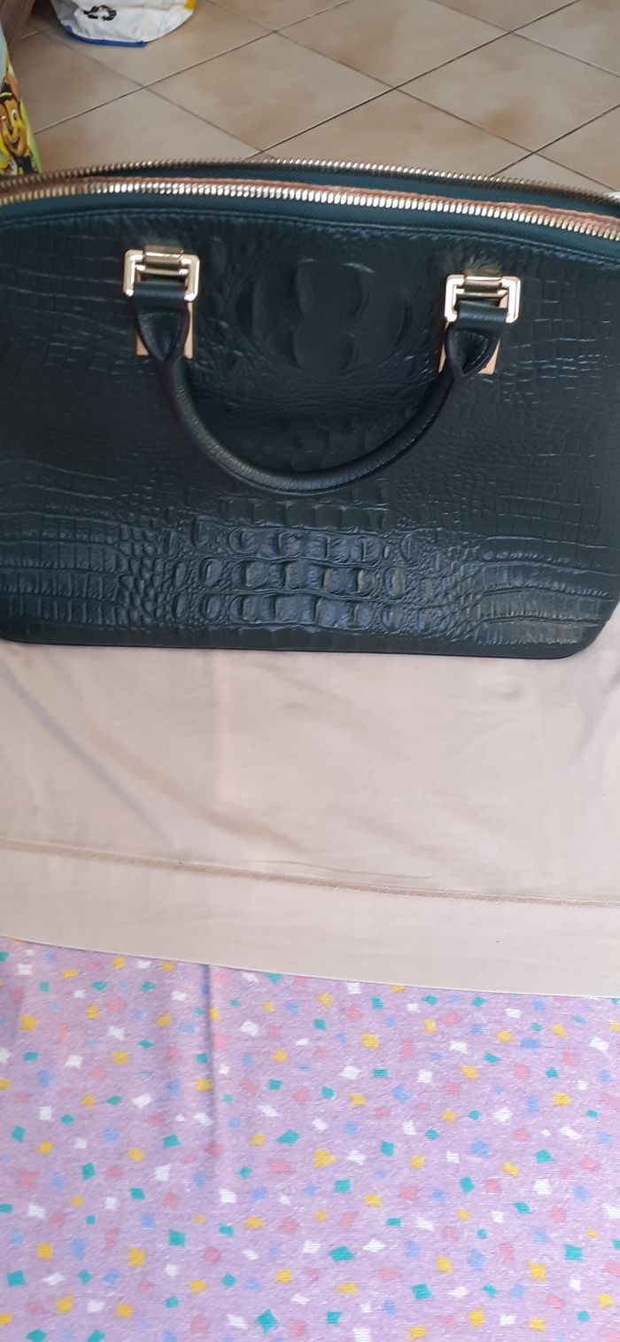 Vends un sac à main grand, avec anses et bandoulière, 2 compartiments, 1 grande poche à fermeture éclair et 3 petites poches à l'intérieur, 1 poche à fermeture éclair à l'extérieur, couleur vert foncé aspect croco, pieds en métal sur le fond pour ne pas l'abîmer, marque Qiwang. Longueur : 39 cm Hauteur : 25 cm Largeur à la base : 12,5 cm.