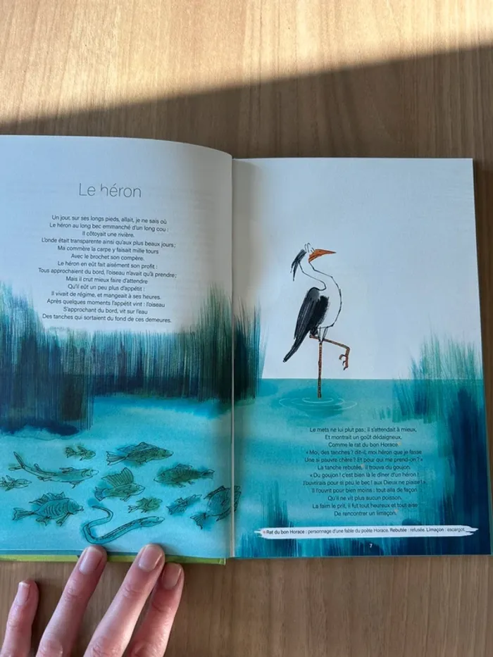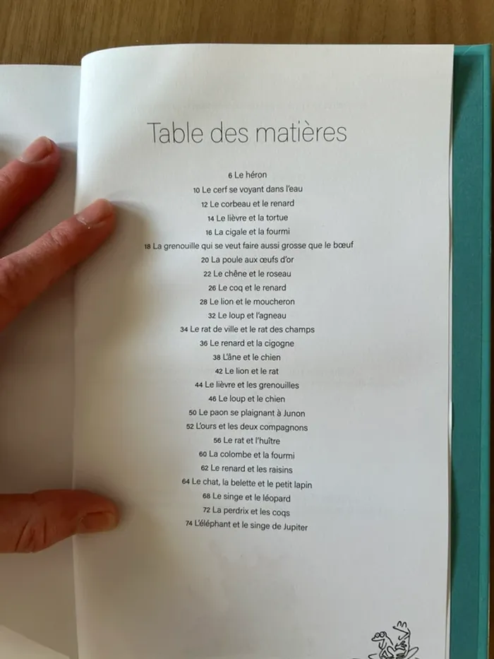 Le héron Le cerf se voyant dans l’eau Le corbeau et le renard Le lièvre et la tortue La cigale et la fourmi La grenouille qui se veut faire aussi grosse que le bœuf La poule aux œufs d’or Le chêne et le roseau Le coq et le renard Le lion et le moucheron Le loup et l’agneau Le rat de ville et le rat des champs Le renard et la cigogne L’âne et le chien Le lion et le rat Le lièvre et les grenouilles Le loup et le chien Le paon se plaignant à Junon L’ours et les deux compagnons Le rat et l’huître La colombe et la fourmi Le renard et les raisins Le chat, la belette et le petit lapin Le singe et le léopard La perdrix et les Coq L’éléphant et le singe de Jupiter Excellent état