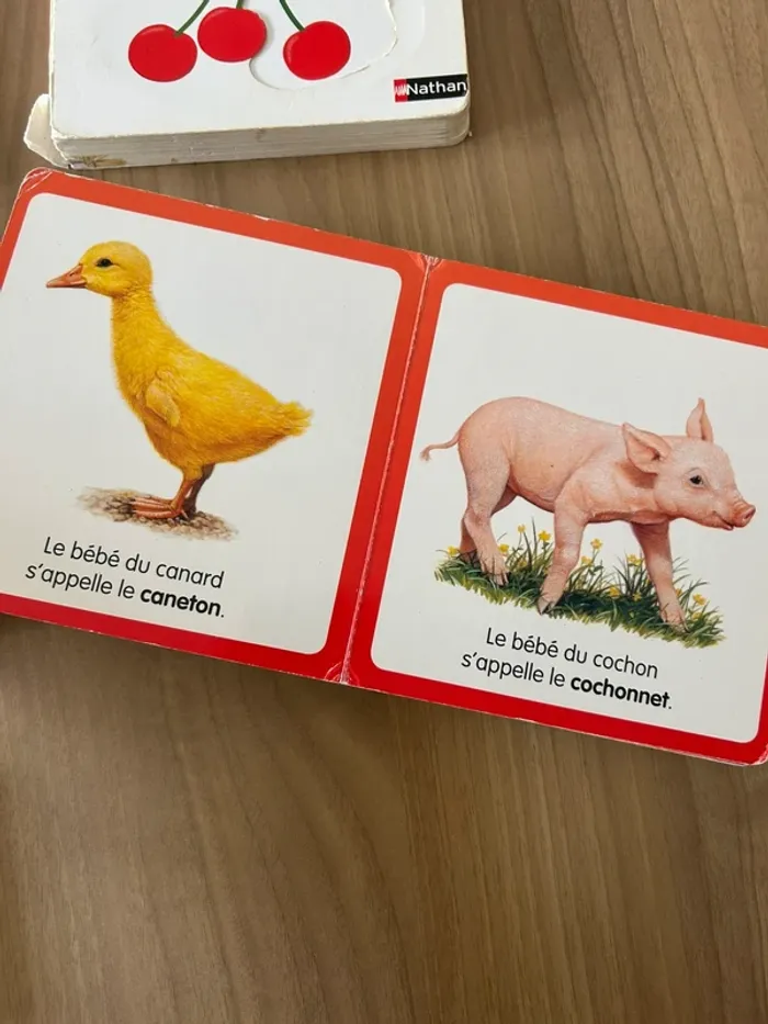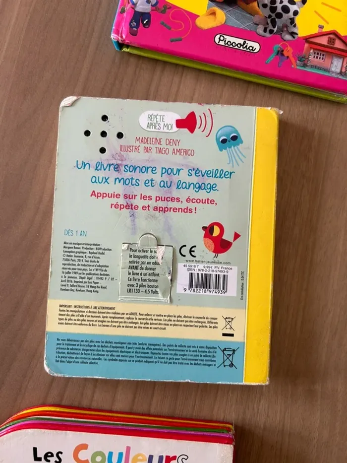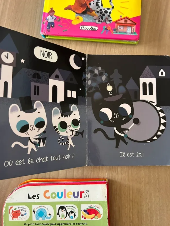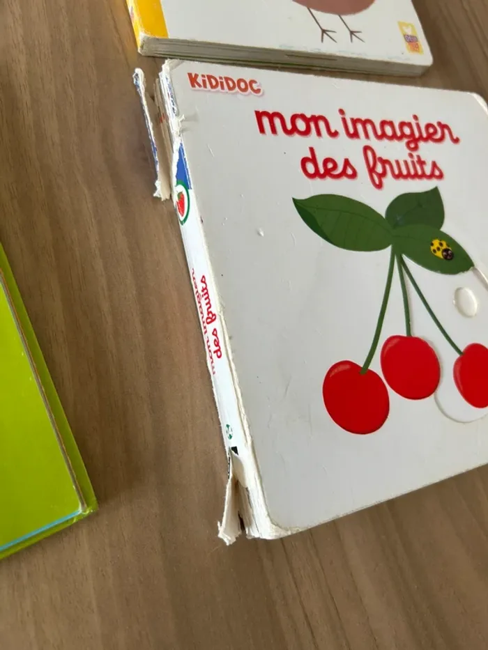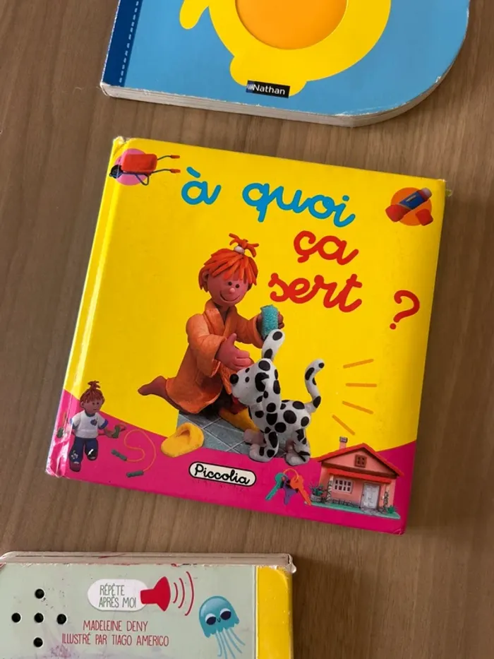 Livres en bon état et non très bon état car cartoons sont à toucher et ont été bien utilisés Certains sont scotchés par endroits Les livres restent complets et bien appréciés des enfants Imagier de la mer, imagier des bébés animaux, les chiffres, les couleurs, imagier des fruits, à quoi ça sert de piccolia