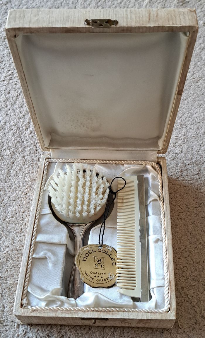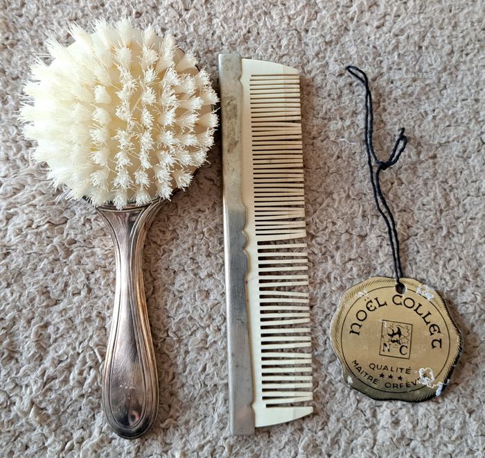 Coffret vintage avec brosse et peigne en métal argenté, par Noël Collet maître orfèvre, 12cm environ 🛠️ État : bon état, boite usagée avec traces d'humidité (voir photos pour plus de détails) 📦Envoi rapide, suivi et soigné 🤝 Vente directe possible sur Berck (62600) ➡️ Intéressé(e) par plusieurs articles ? Regroupez vos achats pour économiser sur les frais de port ! 📩 Besoin d'infos supplémentaires ? Je suis dispo, n'hésitez pas ! Broc'Ant – Jouets • Jeux Vidéo • Brocante • Objets de Collection #brocant #brocantdeco #vintage #collection #retro #ancien #deco #coffret #coiffure #bapteme #anniversaire #naissance