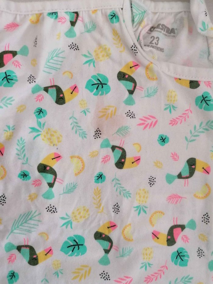 Très jolie combinaisons,bon état mais qui présente des tâches visibles de près, peut être utilisée pour de courtes sorties ou la maison, conviendra pour l'été, (23 mois - 86cm)