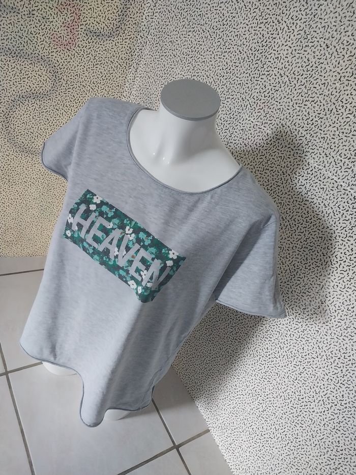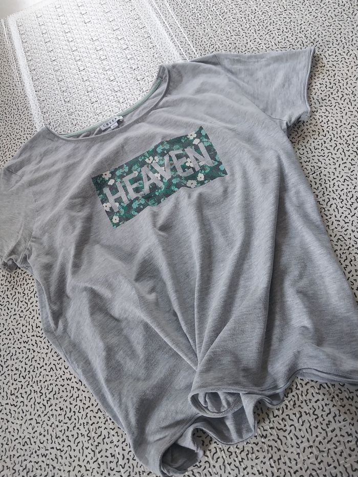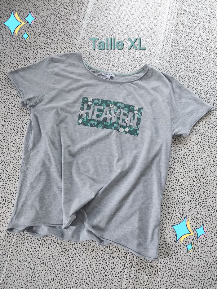 Gris clair, 100% coton, motif fleuri avec inscription HEAVEN 🌸 Confortable, léger et stylé pour un look décontracté ✨ 📏 Taille XL 💎 Bon état #tshirt #Creeks #femmeXL #modefemme #lookdécontracté