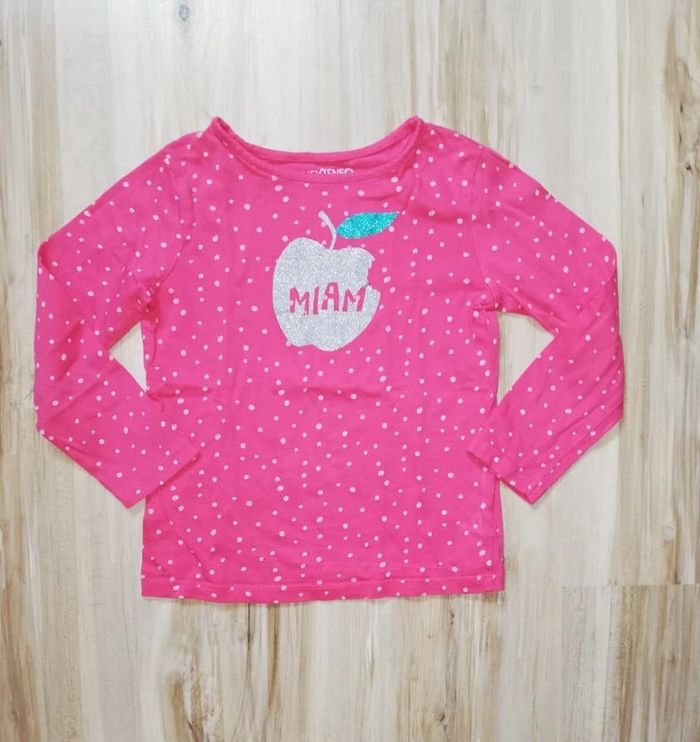 T Shirt rose à pois blancs manches longues In Extenso 6 ans avec une pomme " Miam