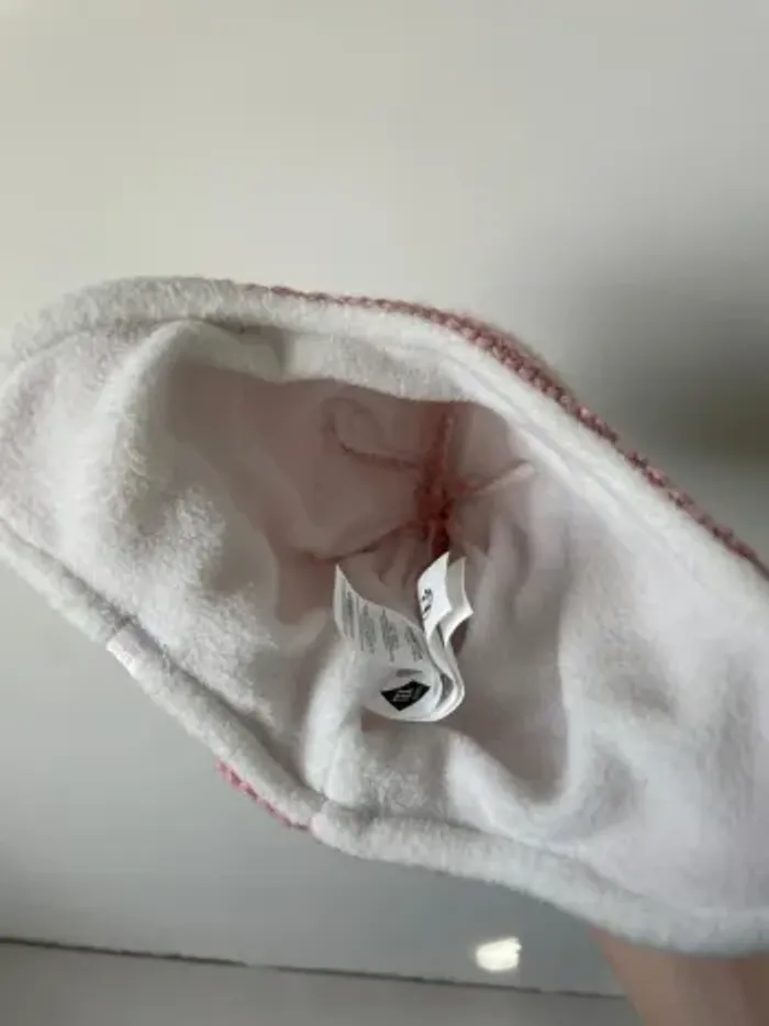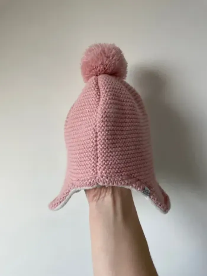 Bonnet péruvien en laine rose doublée de polaire blanche. Avec pompon Quasi neuf Taille 0-3 mois sur l’étiquette.