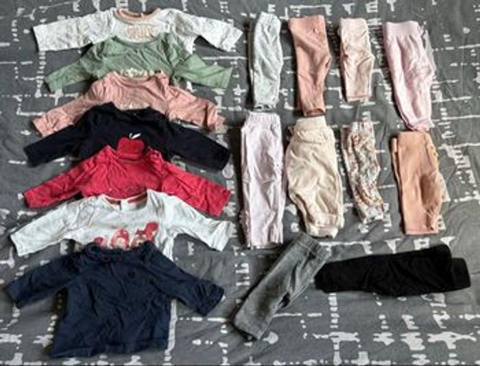Lot pour bébé fille taille 1 mois qui contient : - 16 pyjamas - 12 body manche longue - 8 body manche courte - 3 body sans manche - 3 gilets - 7 tee shirt manche longue - 10 leggings - 3 robes - 3 combinaison short - 1 tee shirt manche courte - 2 combinaisons pantalon