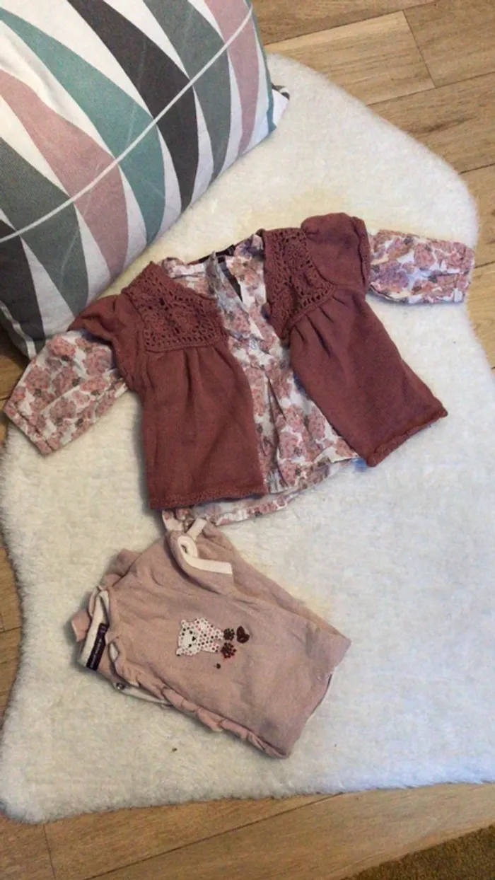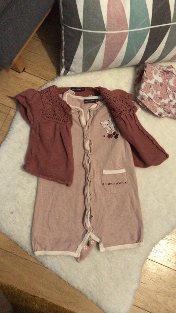 bonjour, tenu gilet, grenouillère sergent major T-shirt fleuri kitchoun 9mois taille bien bonne qualité.