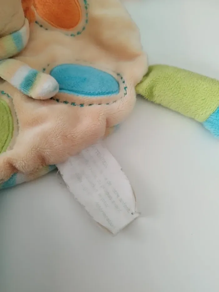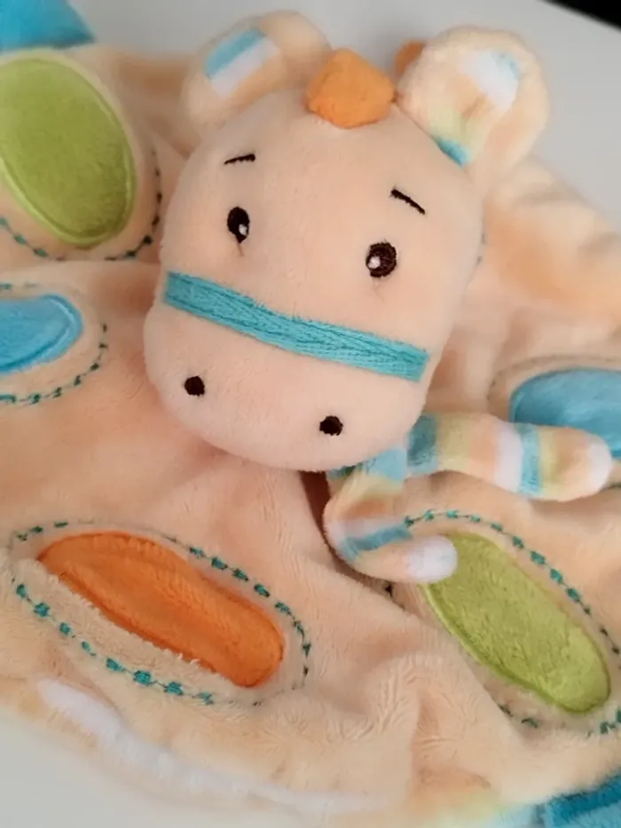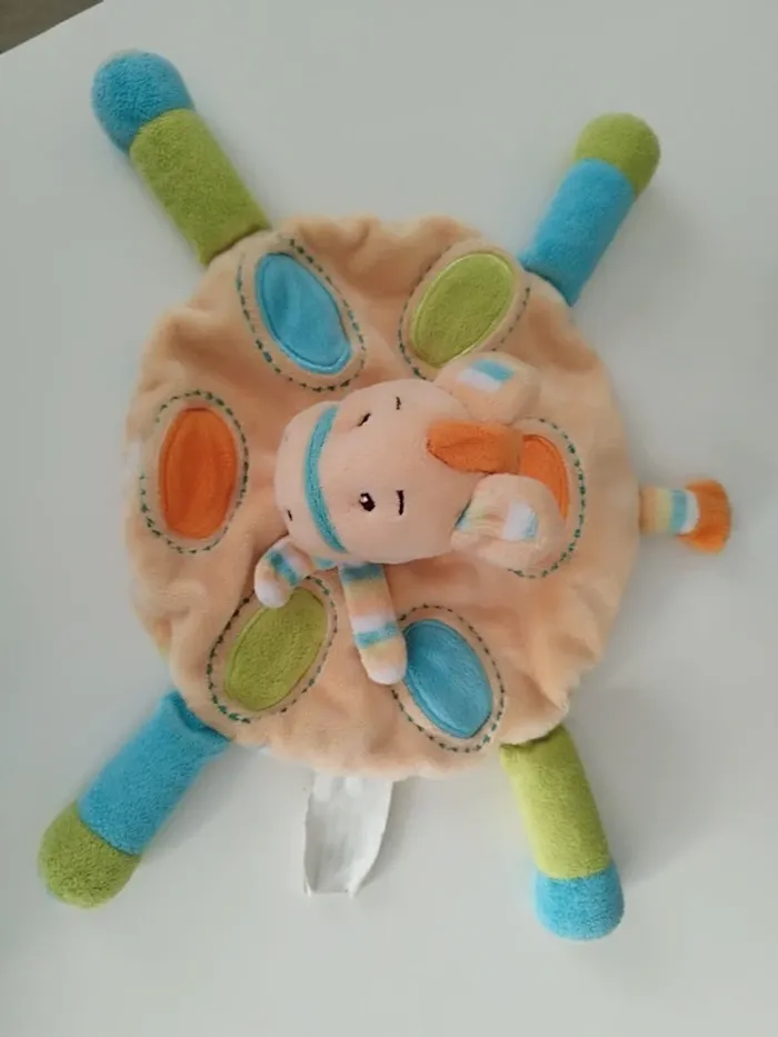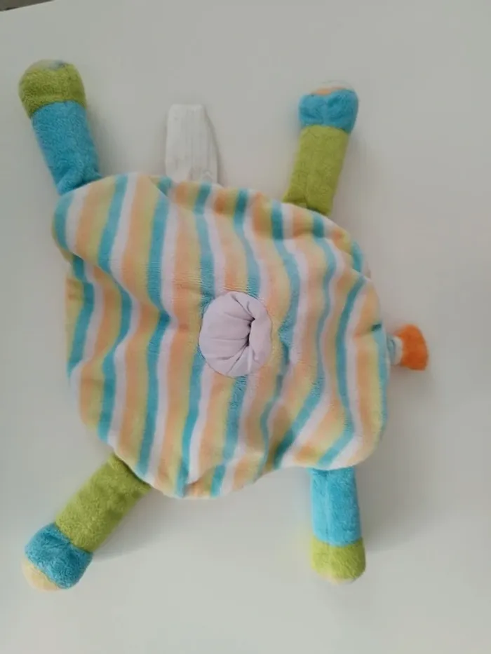 #awlbdoudou Doudou plat rond cheval âne KIMBALOO LA HALLE jaune bleu vert orange rayures dos Très bon état étiquette délavée voir photos
