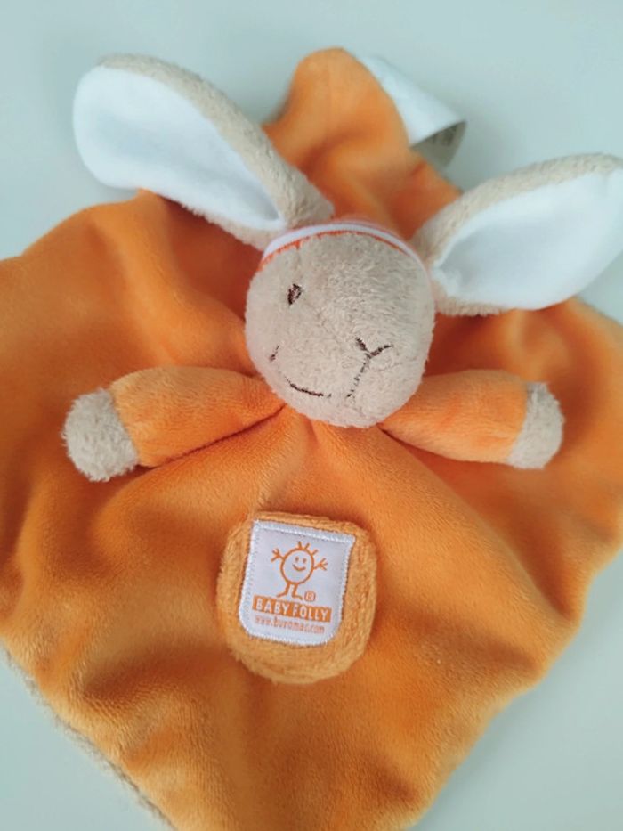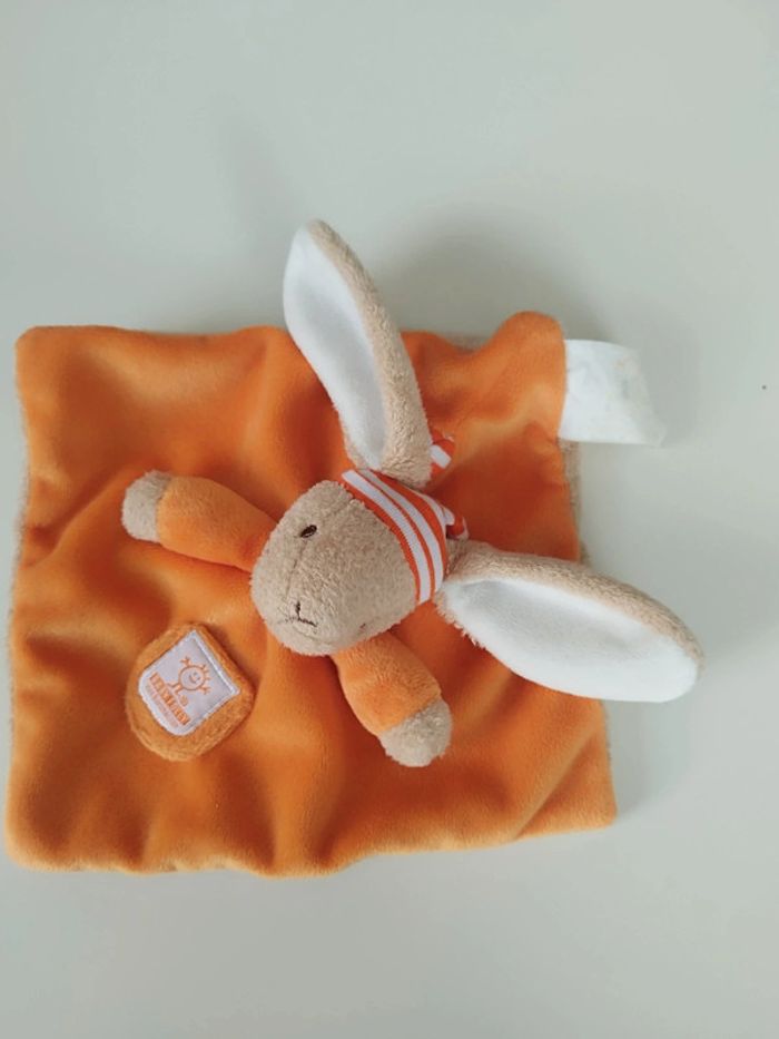 #awlbdoudou Peluche doudou Lapin orange beige blanc rayé Baby Folly Buromac Très bon état sauf étiquette effacée voir photos