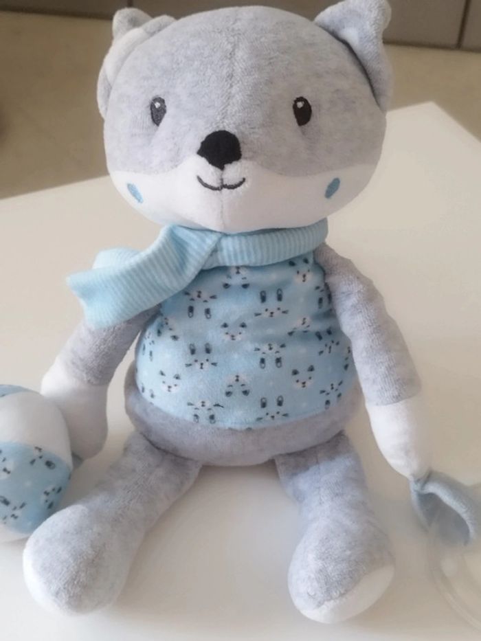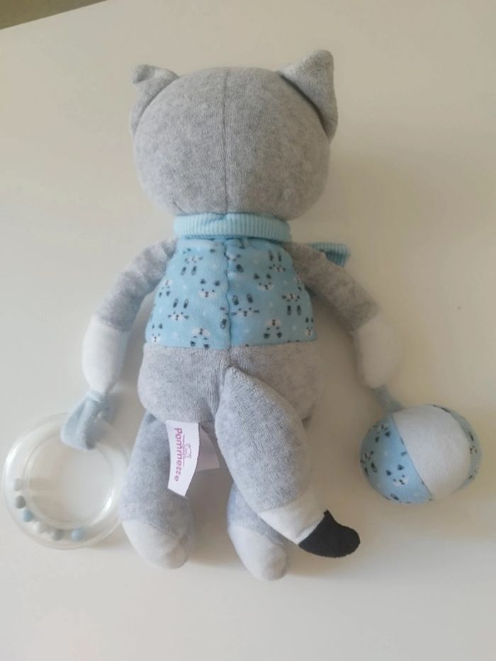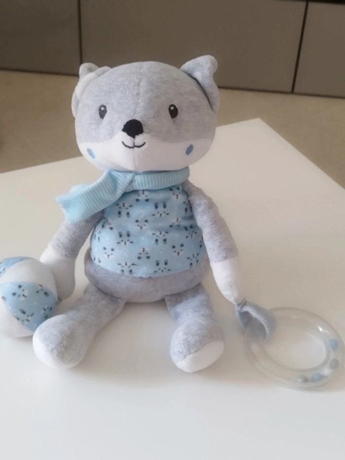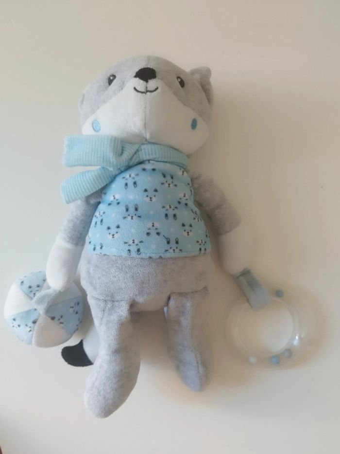 #awlbdoudou Peluche Doudou RENARD Pommette Intermarché jouet éveil bébé Velours tout doux gris bleu et blanc Avec anneau bille et petite balle bruit de pouet pouet
