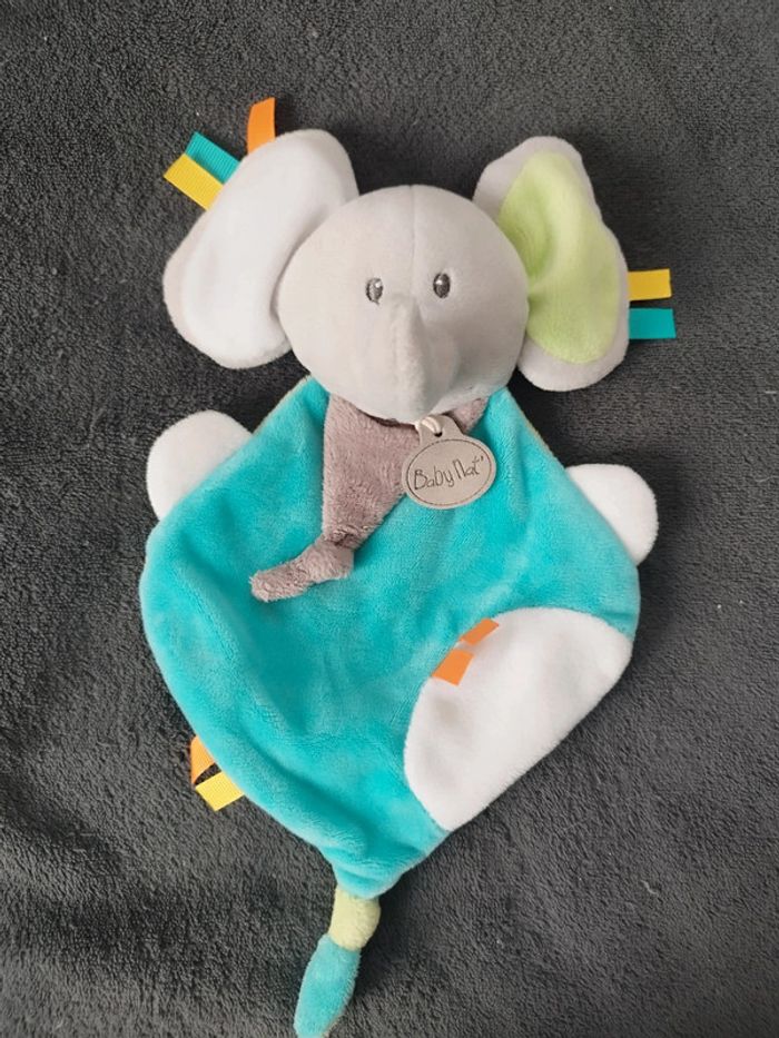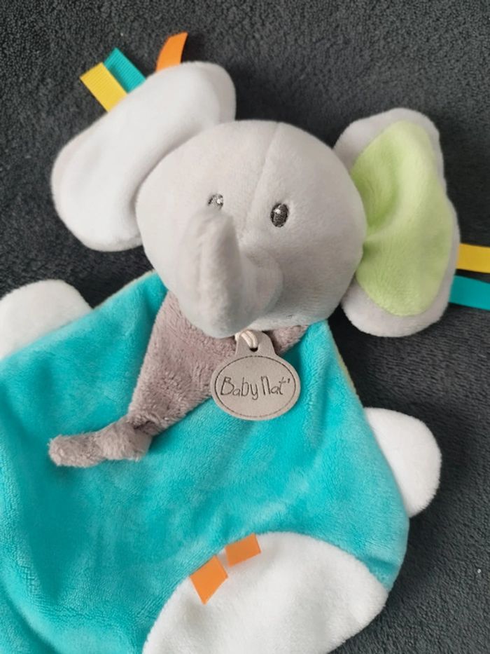 #awlbdoudou Peluche Doudou plat éléphant BABY NAT' Les copains gris bleu vert BN0232 Très bon état voir photos étiquette manquante
