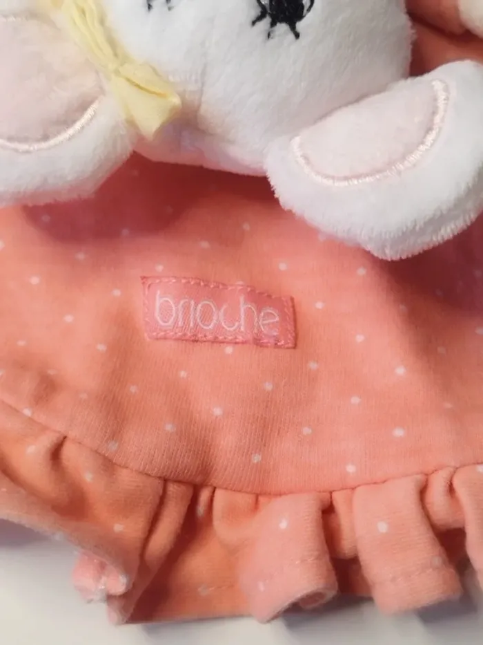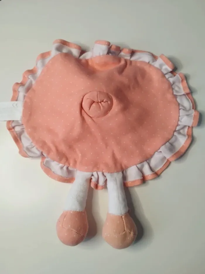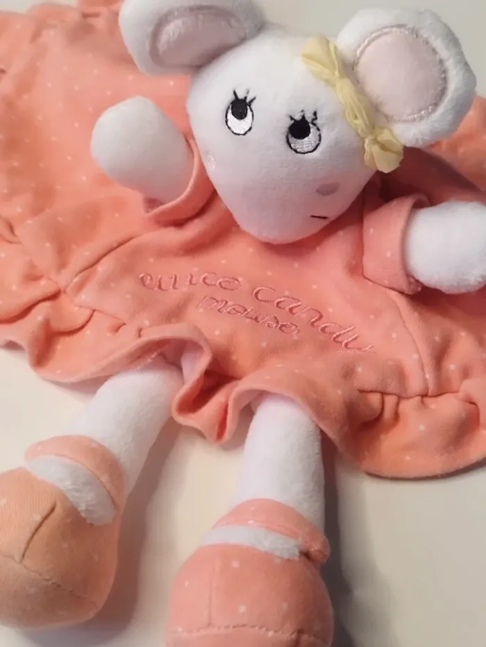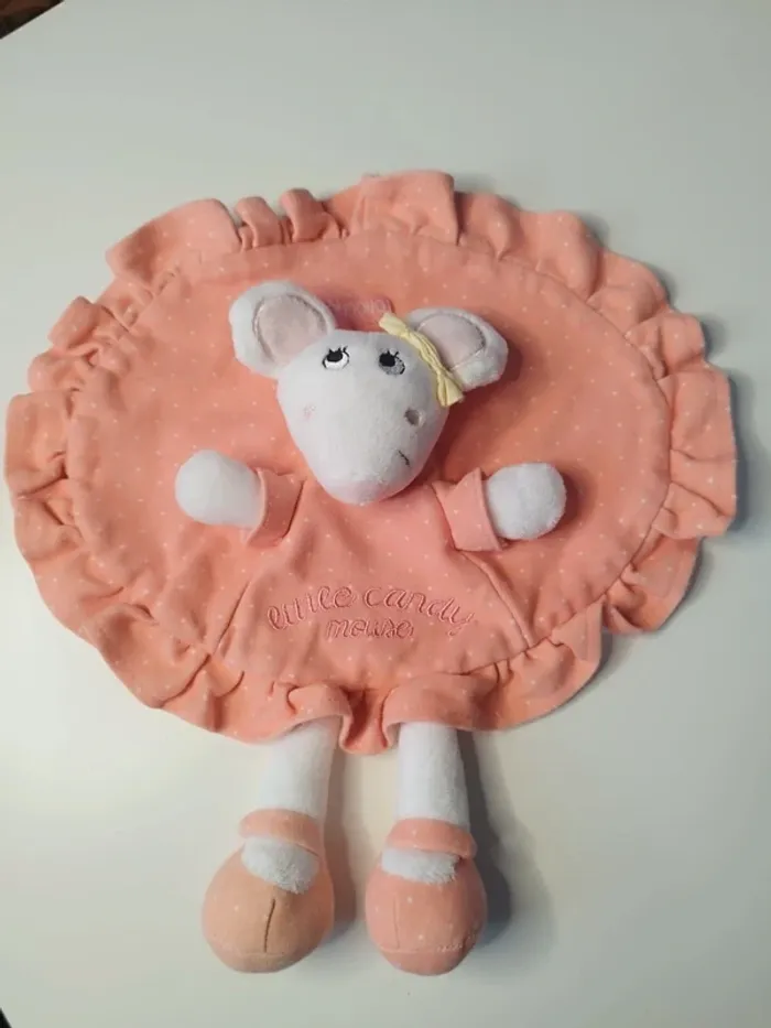 #awlbdoudou Peluche doudou plat poupée souris corail abricot blanc Brioche La Halle broderie "little candy mouse" Très bon état étiquette un peu effacée voir photos