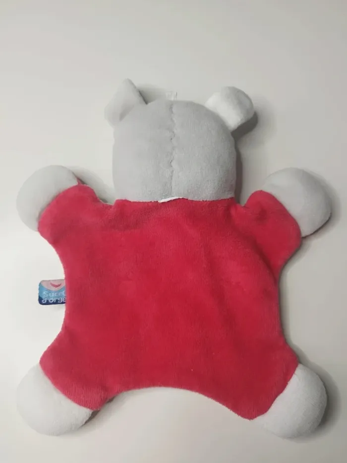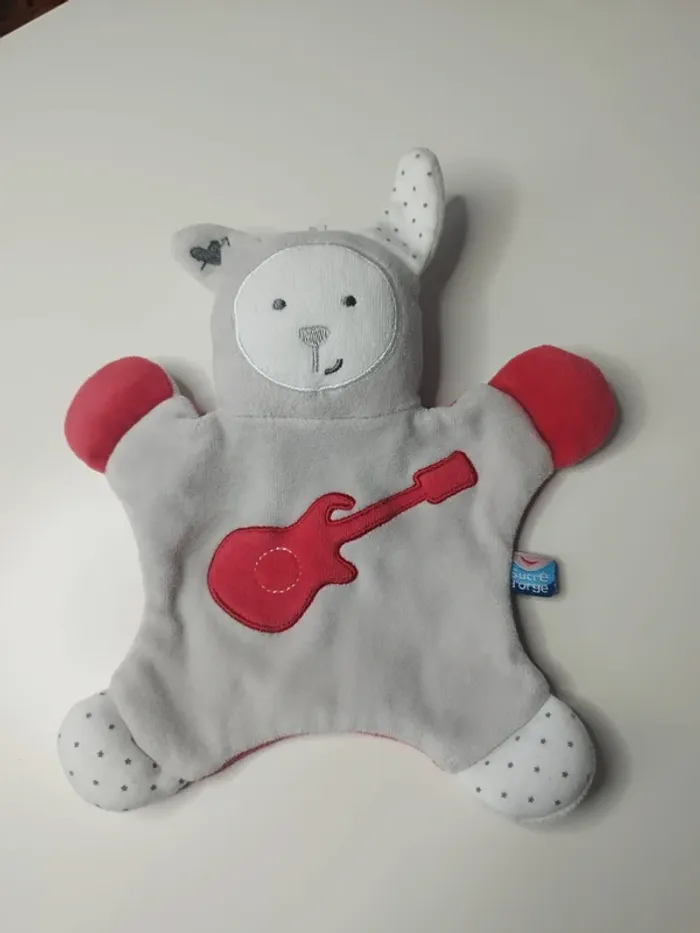 #awlbdoudou Peluche doudou plat molletonné Lapin gris rouge blanc Guitare Sucre d'orge Très bon état voir photos étiquette lavage coupée