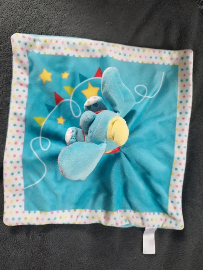 #awlbdoudou Peluche doudou plat Dumbo turquoise theme cirque étoiles multicolores Disney Nicotoy Très bon état étiquette lavage légèrement effacée voir photos