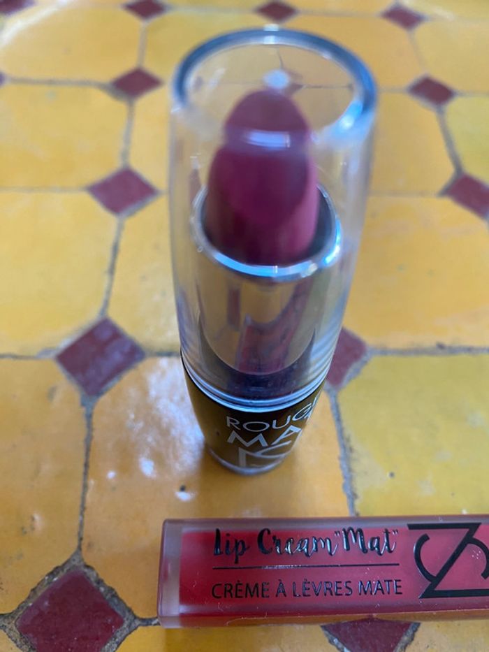 Un gloss et crème à lèvres, mate rouges et un rouge à lèvres. Mat rouge.