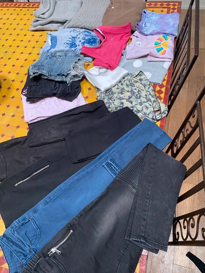 Très gros lot de vêtements d’hiver en taillexs, taille 34 un petit peu taille 36 deux pantalons noirs habillés dans un Zara, deux jeans un bleu à noir, trois shorts dans un jean bleu, un jean noir, l’autre en toile rose, un petit ensemble, sa teint short, petit débardeur, trois T-shirtsune brassière de sport, quatre pulls.différentes marques