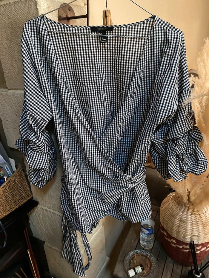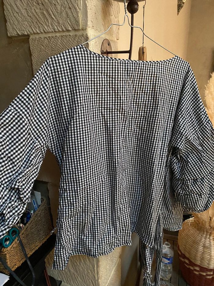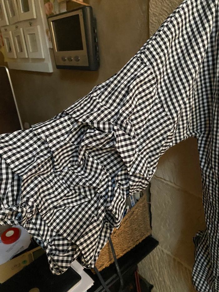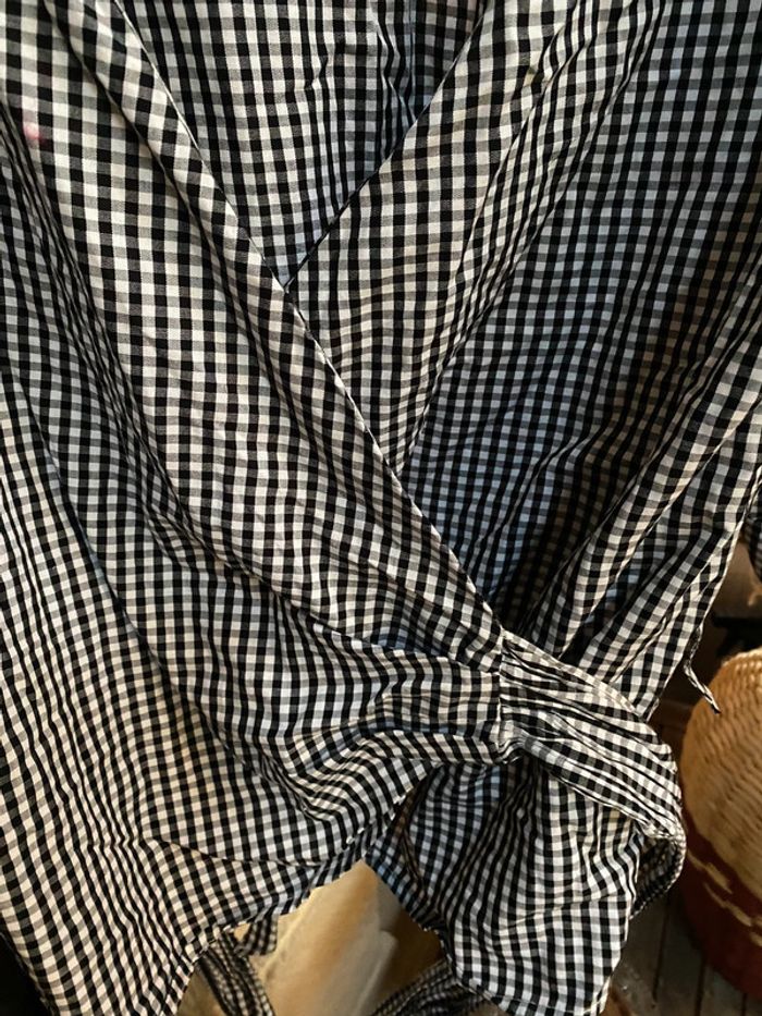 Ostie, chemisier portefeuille s’attache par une ceinture intégrée croisée manches Frou, Vichy, noir et blanc. Taille L.