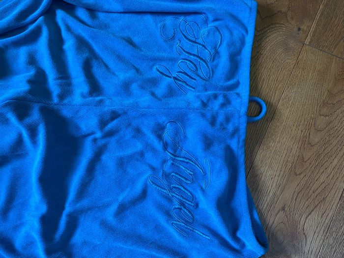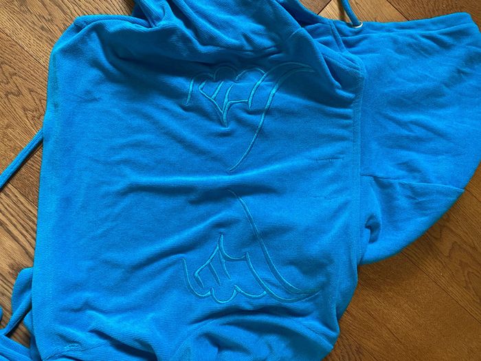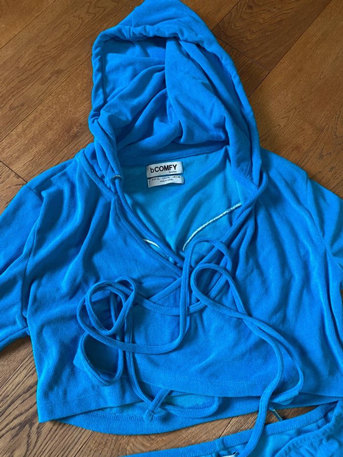 Ensemble, veste et pantalon pattes Def, style un petit peu éponge avec inscription au dos de la veste à capuche qui se croisent et inscription au-dessus des fesses sur le pantalon. Magnifique ensemble bleu canard