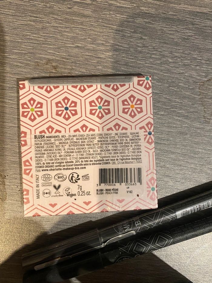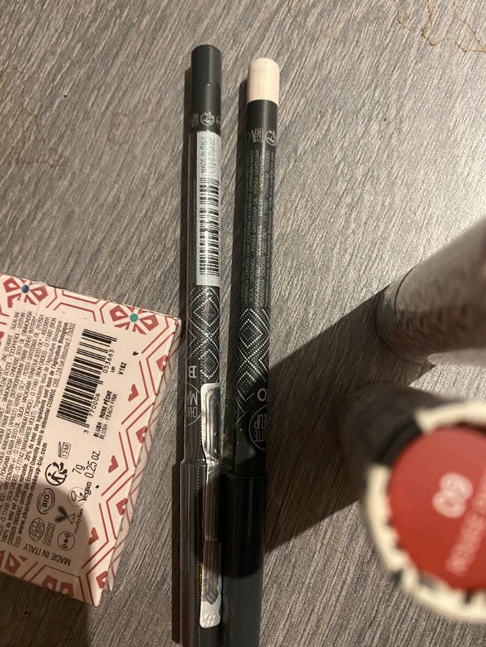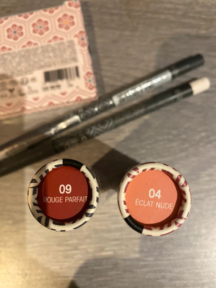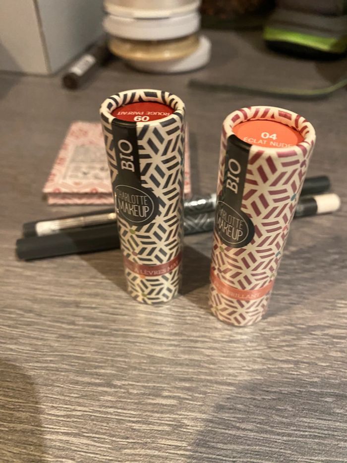 Lot maquillage bio de rouge à lèvres. Référence 04 éclat nude brillant. Référence 09 rouge parfait, un crayon blanc et un crayon gris et un blanche rose pêche