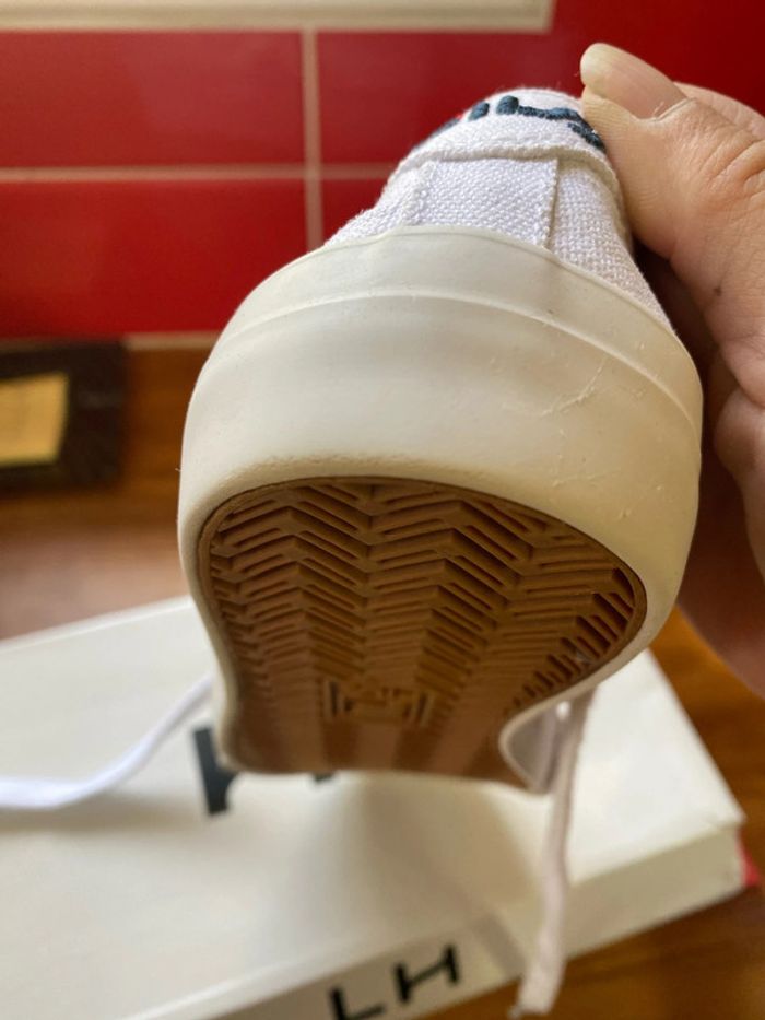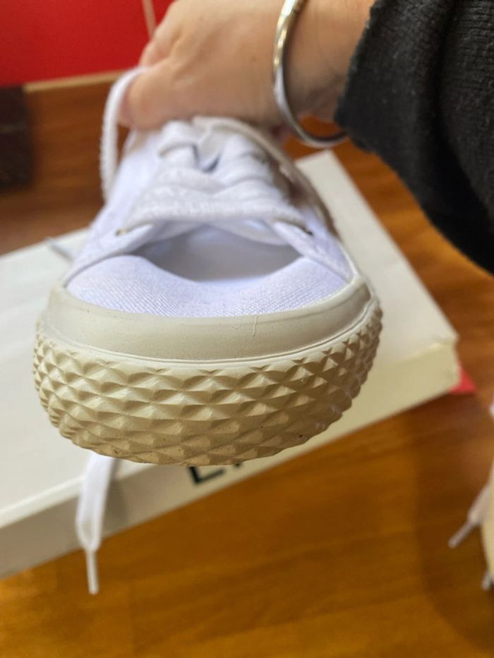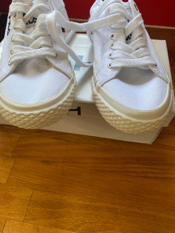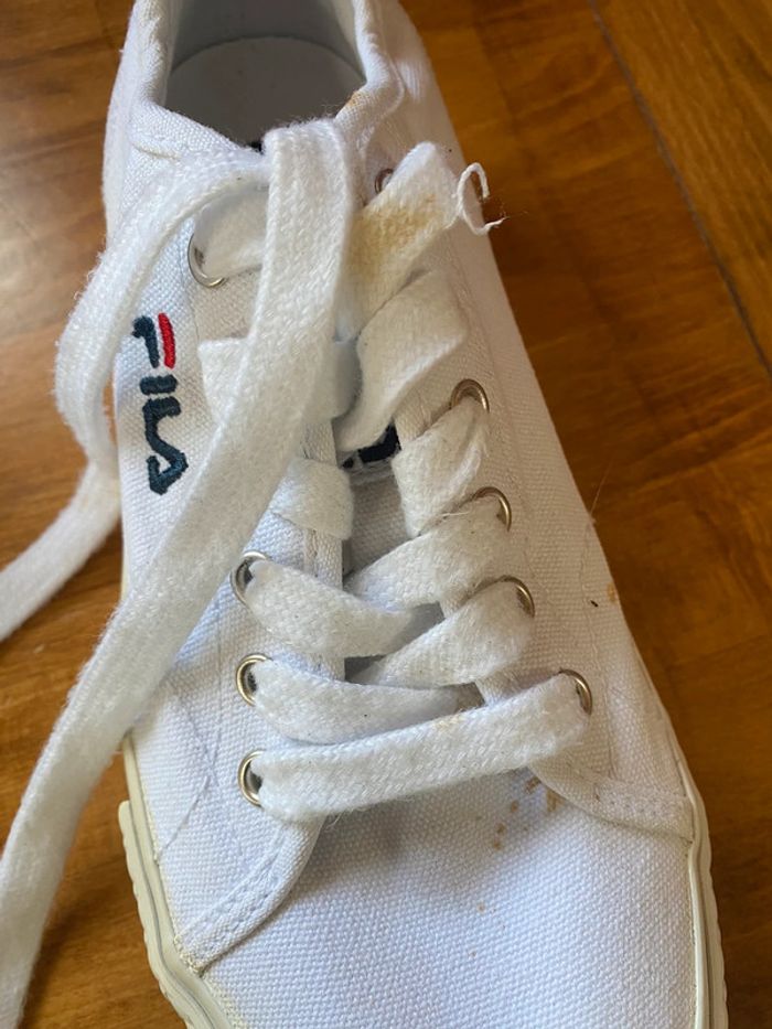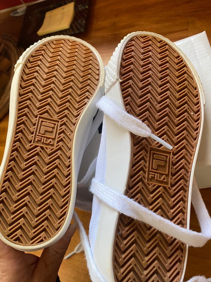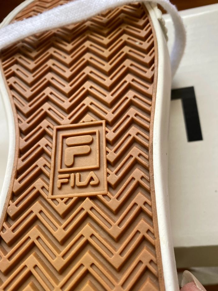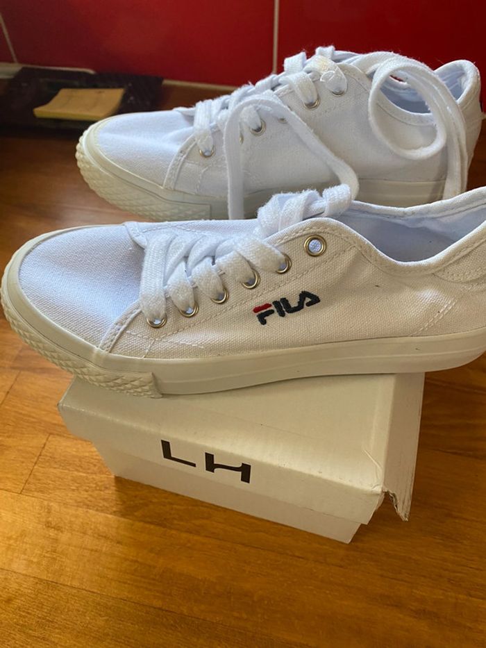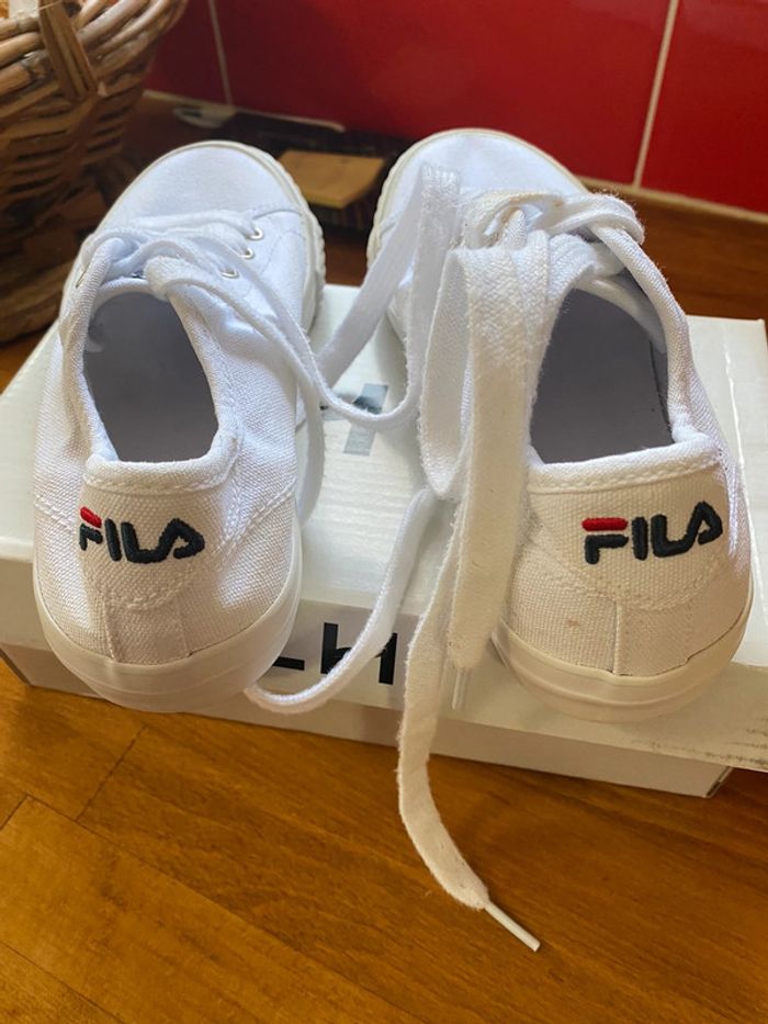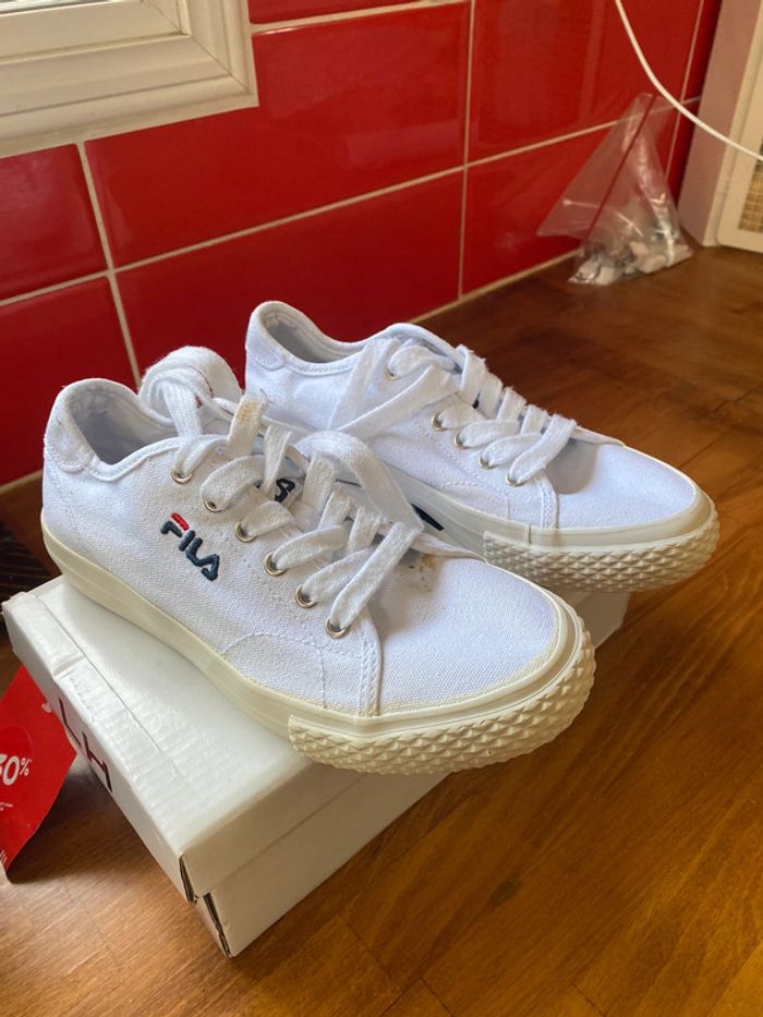 Basket basse, marque fila, taille 36 taille très grande. Plutôt 37. Neuf petit bémol, rien de méchant, quelques taches sur une chaussure que je n’ai pas vu quand je l’ai acheté.