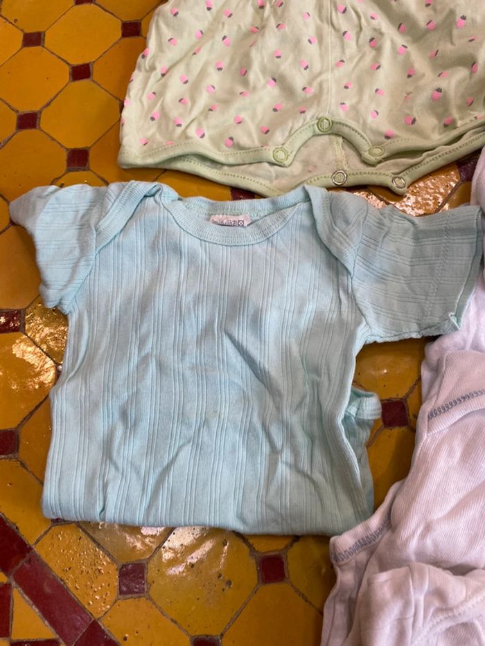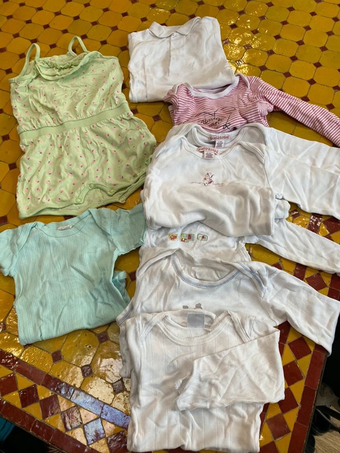 L’eau des filles, 12 mois, un Combi short un body manches courtes, six body manches longues et un T-shirt différentes marques.