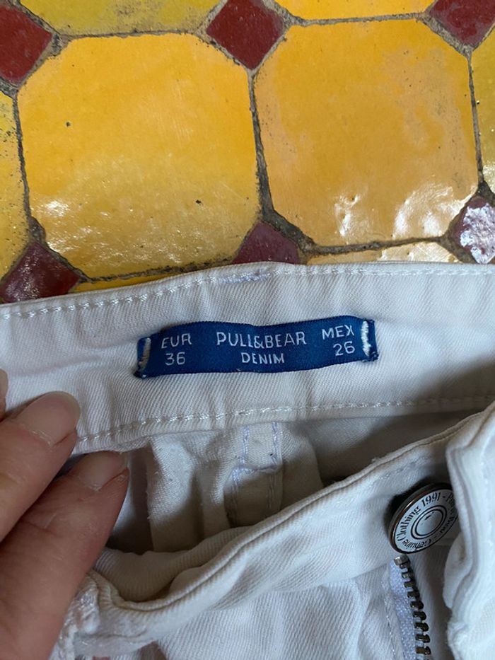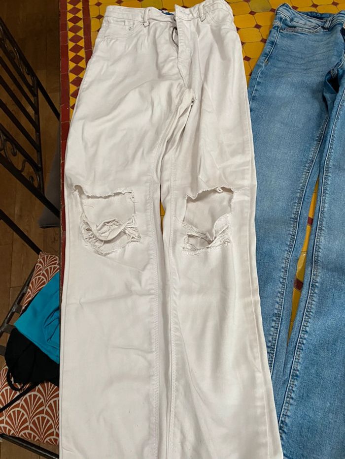 Trois. Jeans différentes tailles Zara, Woman noir, 1LH bleu et un pull and Beer blanc. Deux sont des jeans troués, le blanc, plus que le noir, le bleu non
