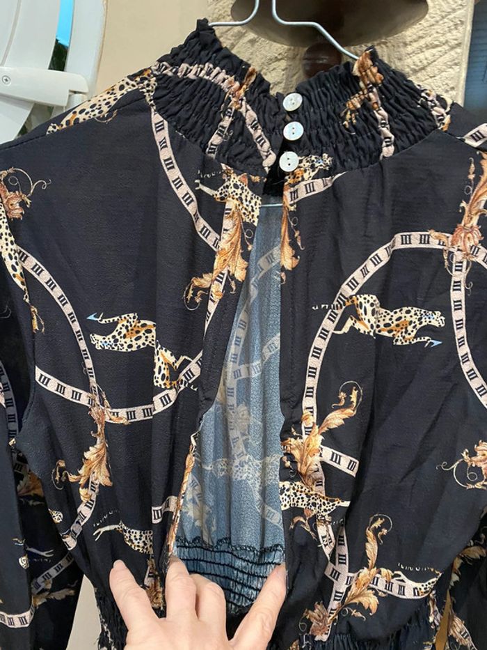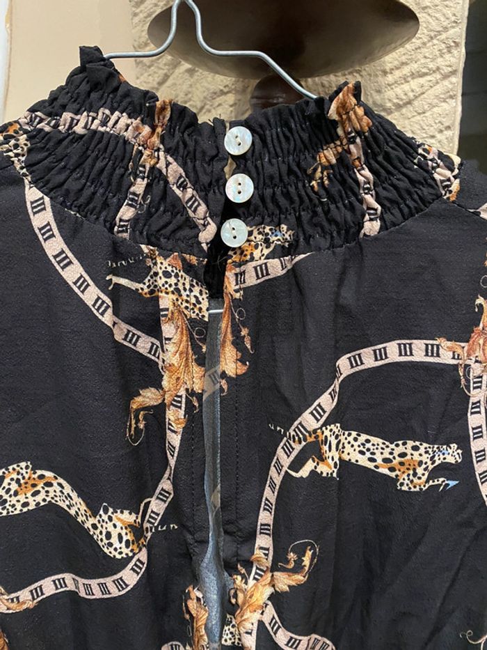 Combinaison, pantalon noir élastique à la taille au poignet et au cou fermé par trois boutons, ouverture dans le dos, pantalon large et fluide