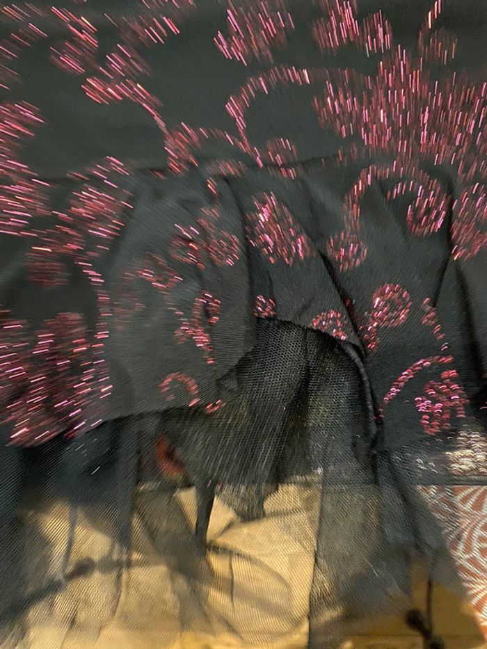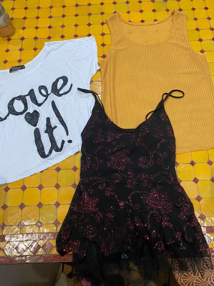 Un petit bretelles avec du tulle bordeaux et noir, un débardeur ajouré, couleur, moutarde et un top style T-shirt inscription bleu marine différentes marques
