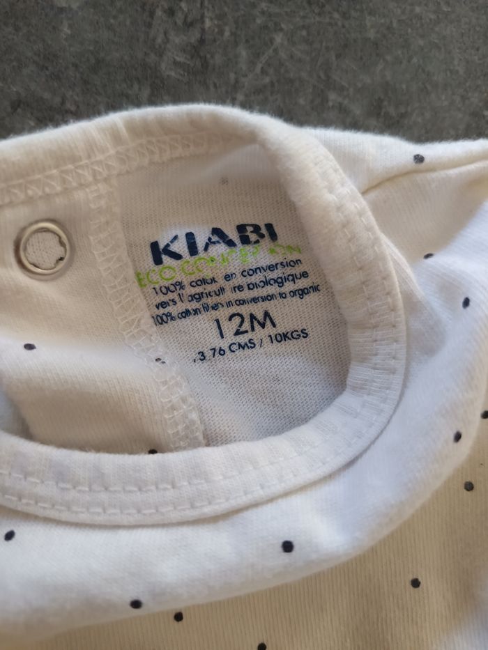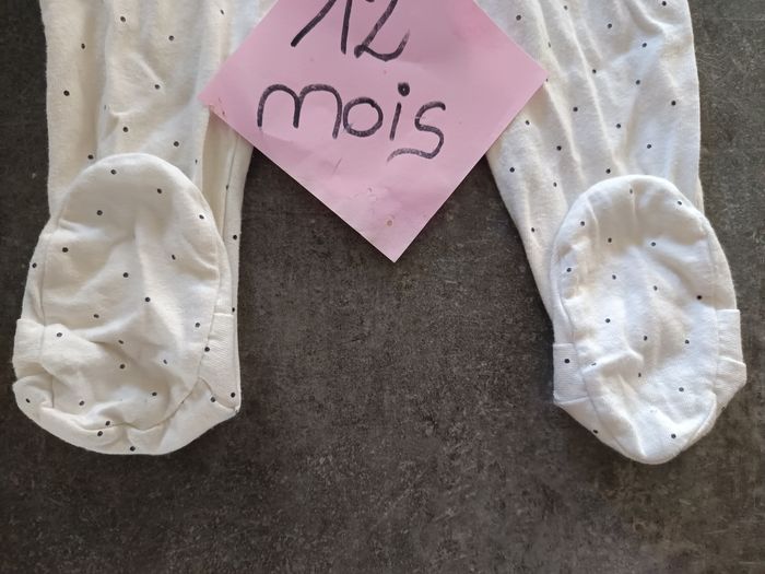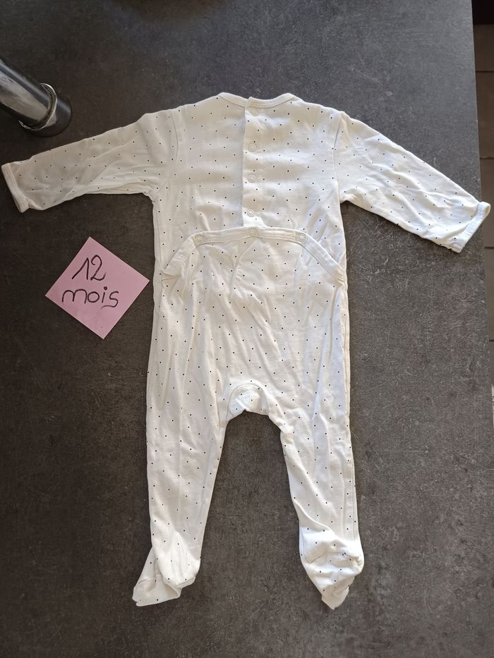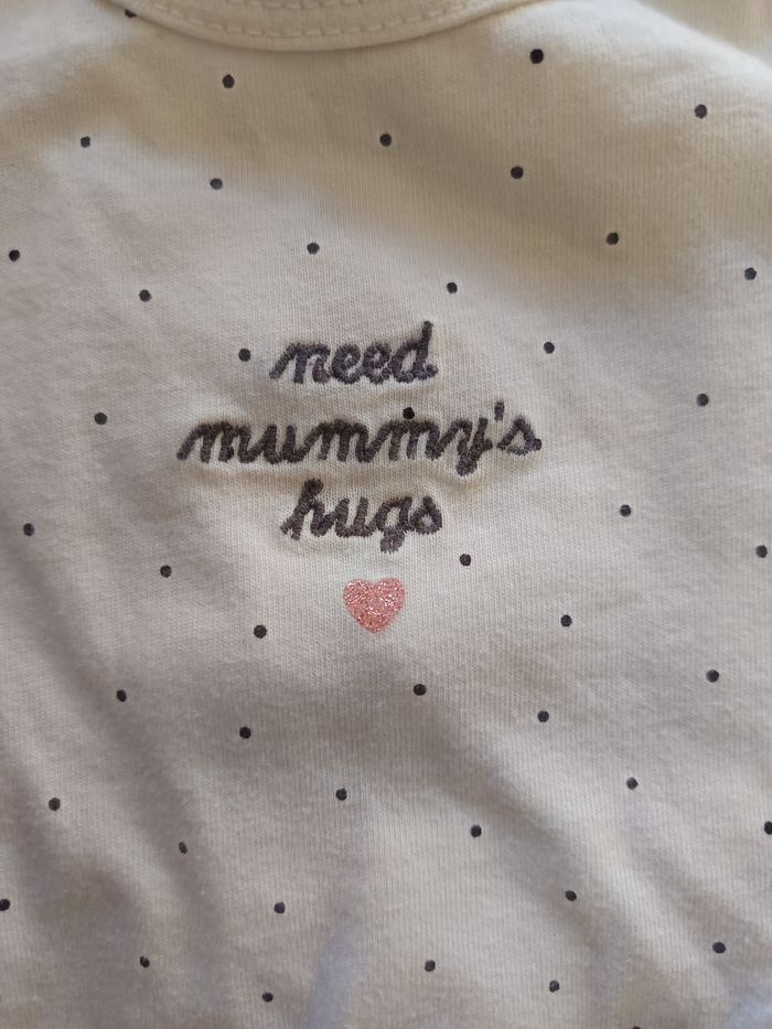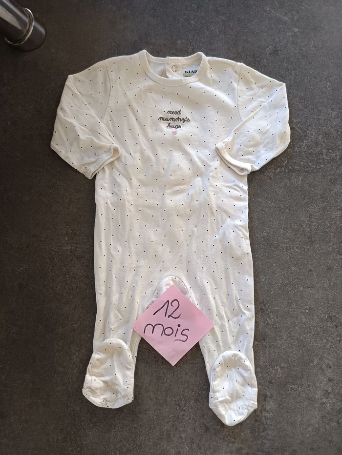 Pyjama en coton, Blanc à pois noir avec inscription "need mummy's hugs" et 1 petit coeur rose pailleté en dessous. comme neuf, porté une ou 2 fois ! Taille 12 mois