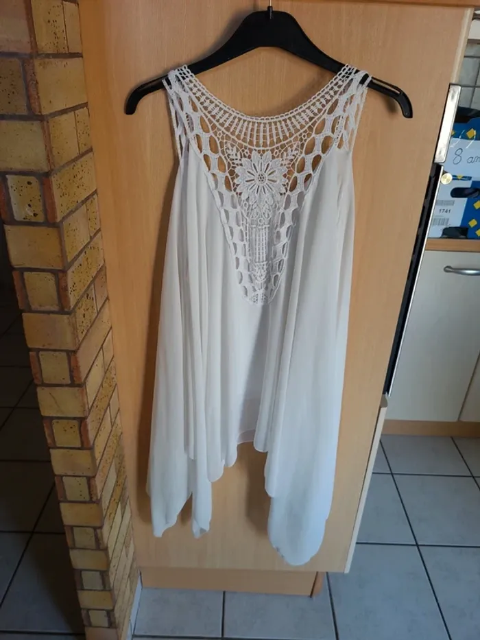 Va jusqu'à une taille 46/48 Blanc voile et broderie 95% polyester 5% élasthanne Neuf Jamais porté Aisselle à aisselle 49 cm Haut en bas 96 cm