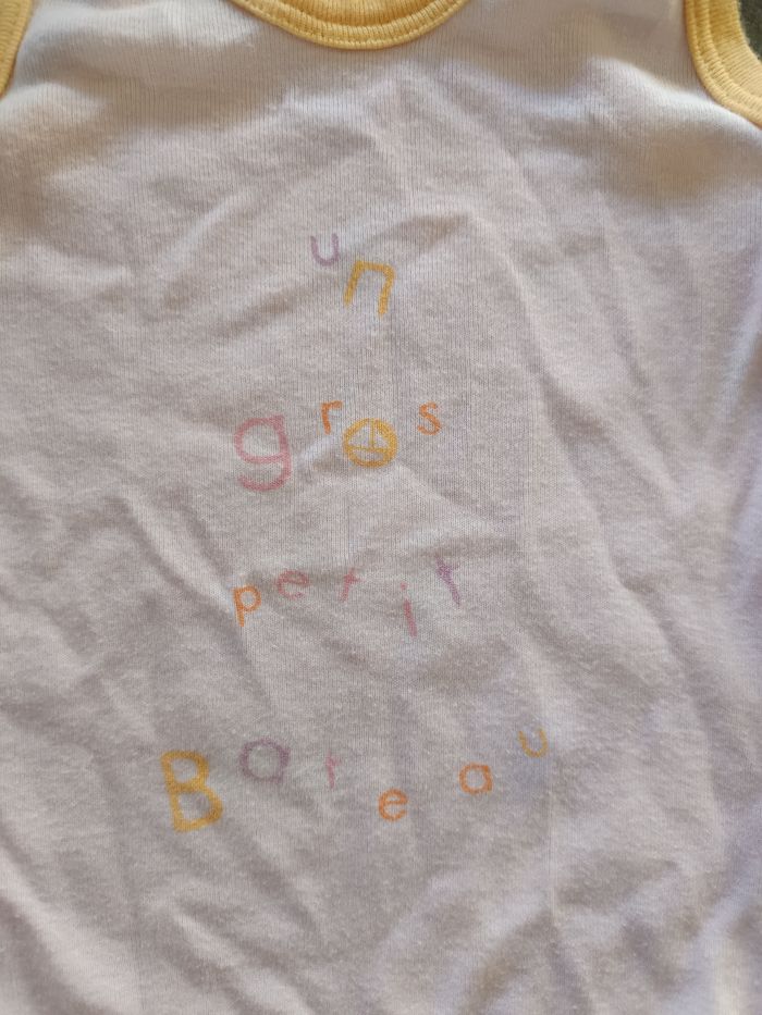 Body sans manches, Rose et jaune avec inscription "un gros petit bateau" Très bon état, Taille 12 mois (74cm)