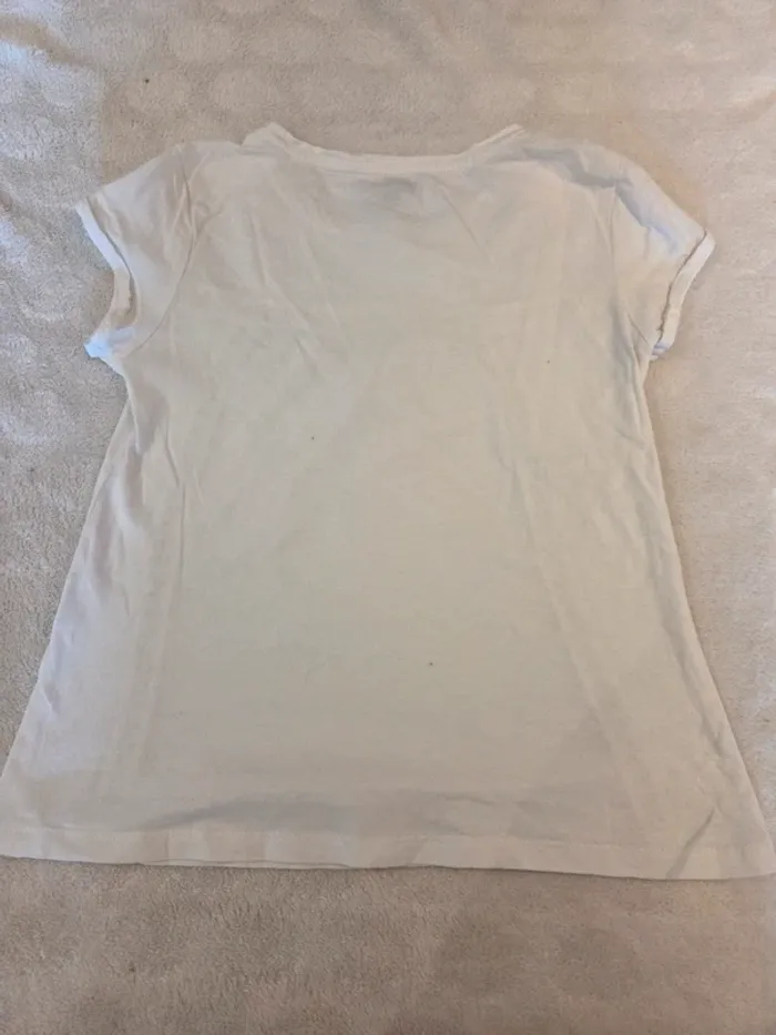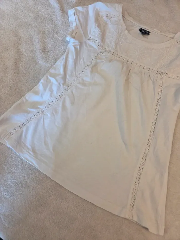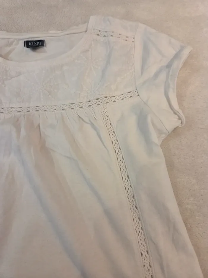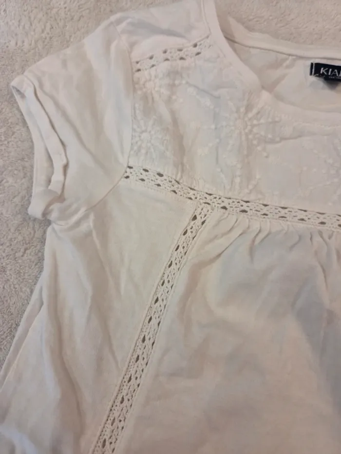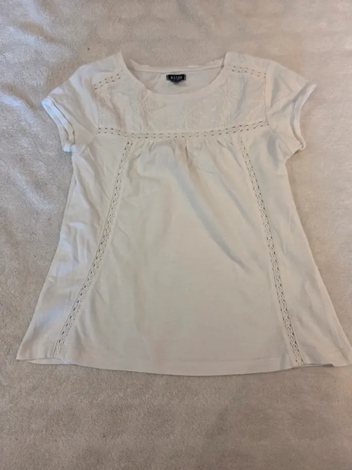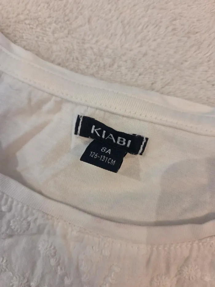 T shirt blanc détail dentelle Tres bon etat. Il n'y a a priori pas de tâches mais sur le blanc parfois possible de trouver une micro tâche. Taille 8 ans kiabi. Envoi rapide et soigné. #8ansloulyd