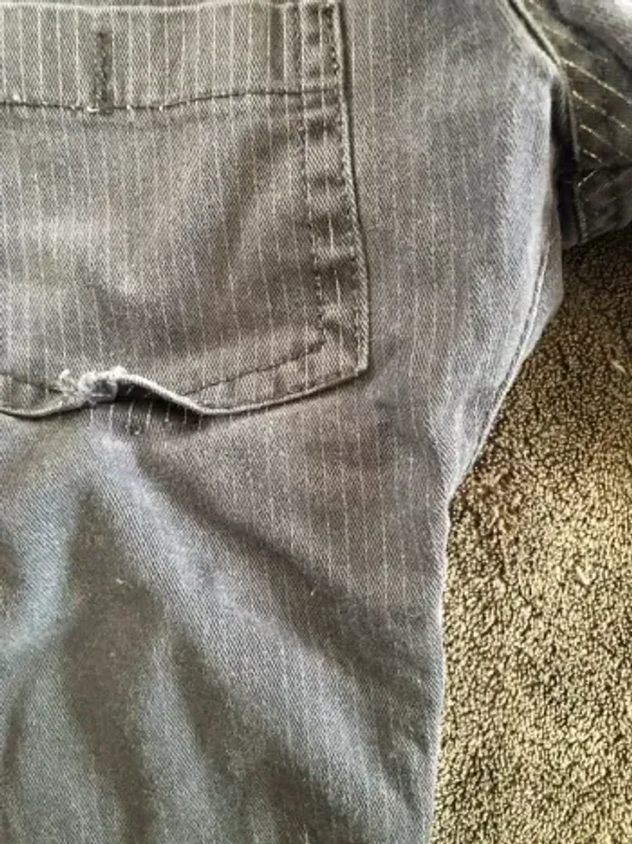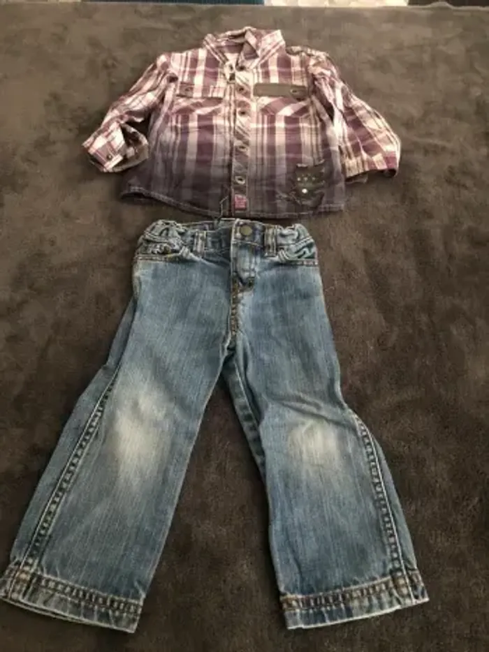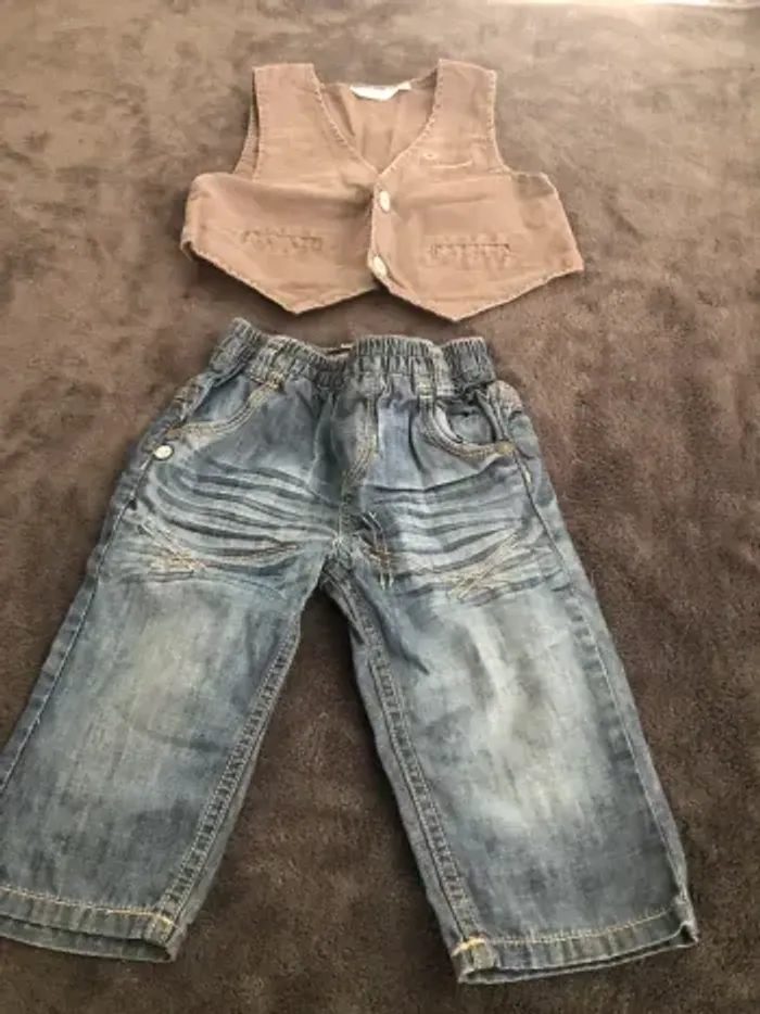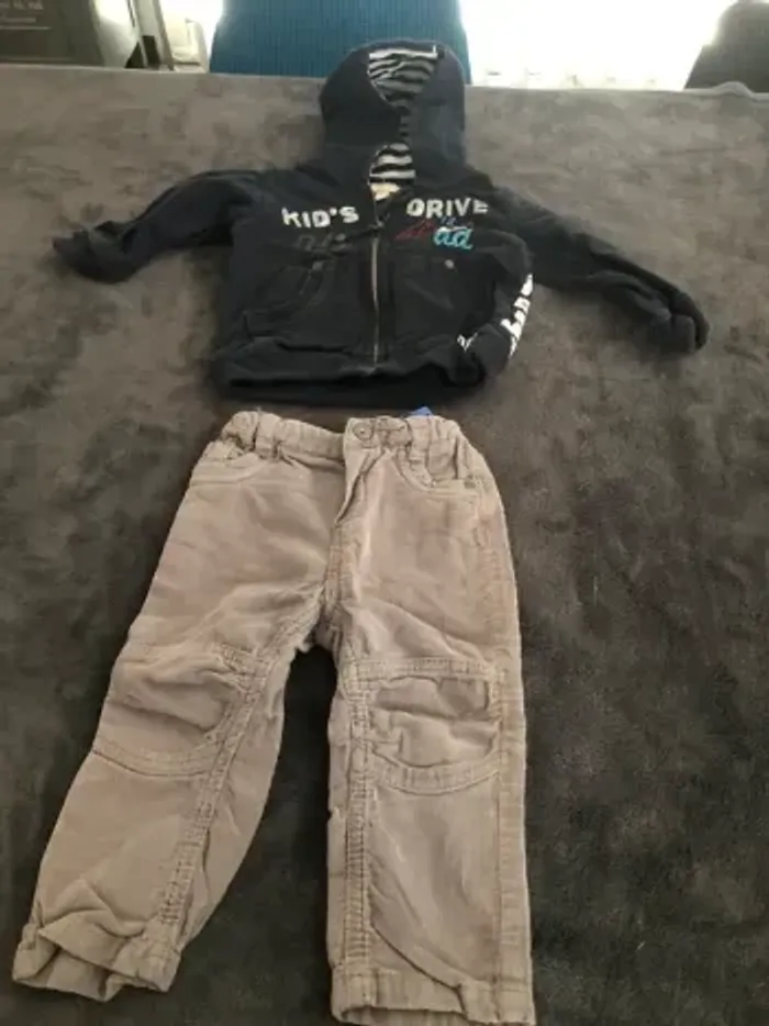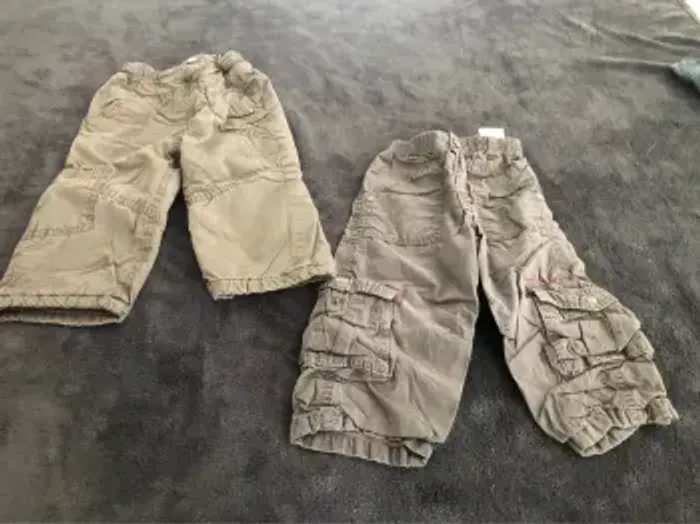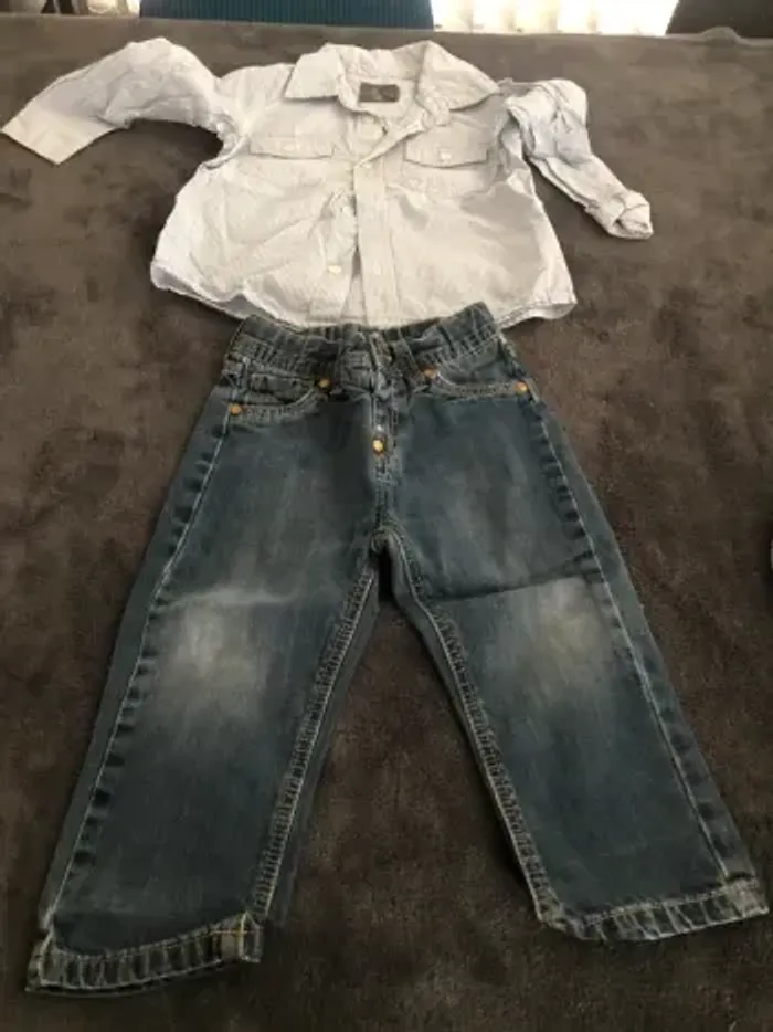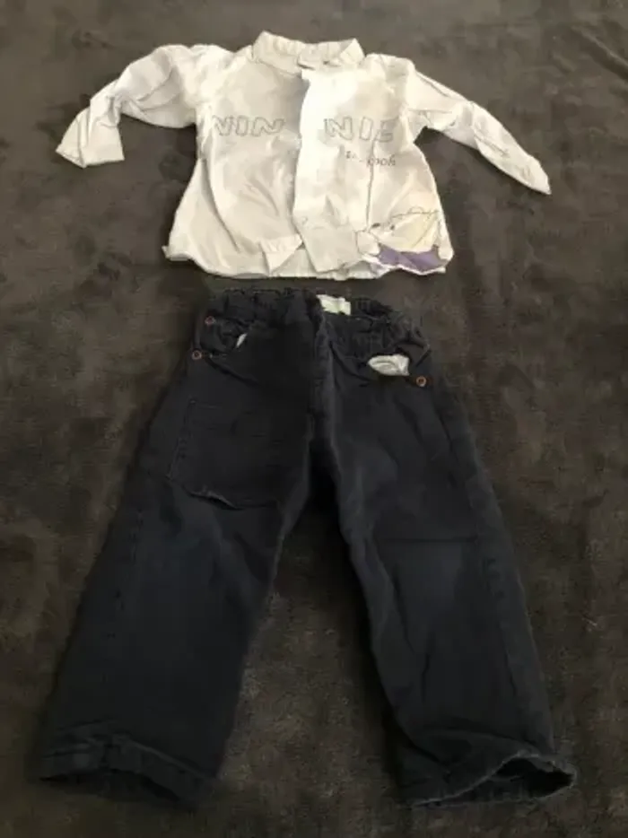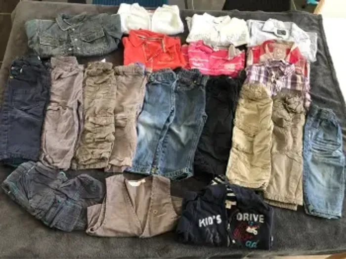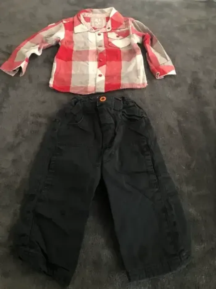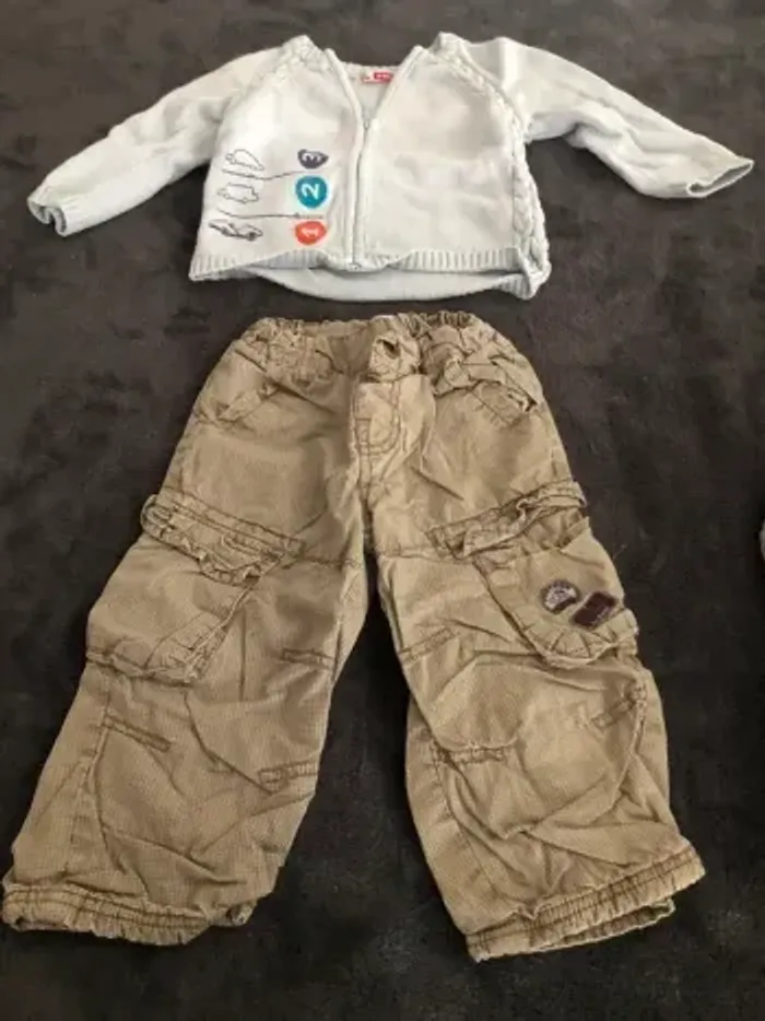 Lot vêtements bébé garçon 18 mois 10 pantalons dont 1 en 12 mois qui taille comme un 18 mois ( 1 avec petit trou a la poche voir photo ) 3 vestes 4 chemises ( 1 légèrement tachée voir photos ) 2 polos mc 1 bolero 24 mois 1 short Bon état